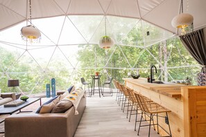With more than enough room to sleep up to 7 guests comfortably, MOON DANCE is our largest dome available and includes a king bedroom, living room with seating, full trundle and a loft with two queen beds.