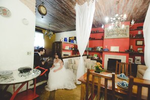 Amenities include a terrace, library and a fireplace at reception