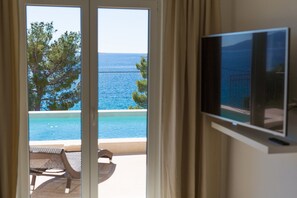 This stunning Five Star seafront villa with heated pool and outdoor Jacuzzi is designed on several levels with unique panoramic sunset views. Only a few steps to a beautiful beach in front of the villa, which will give you a special feeling of peace, freedom and infinite space.