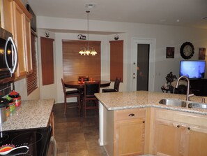 Täysin kalustettu keittiö, jossa grilli takana, tarjoaa monille nautinnollisia aterioita istua ulkona patiolla.