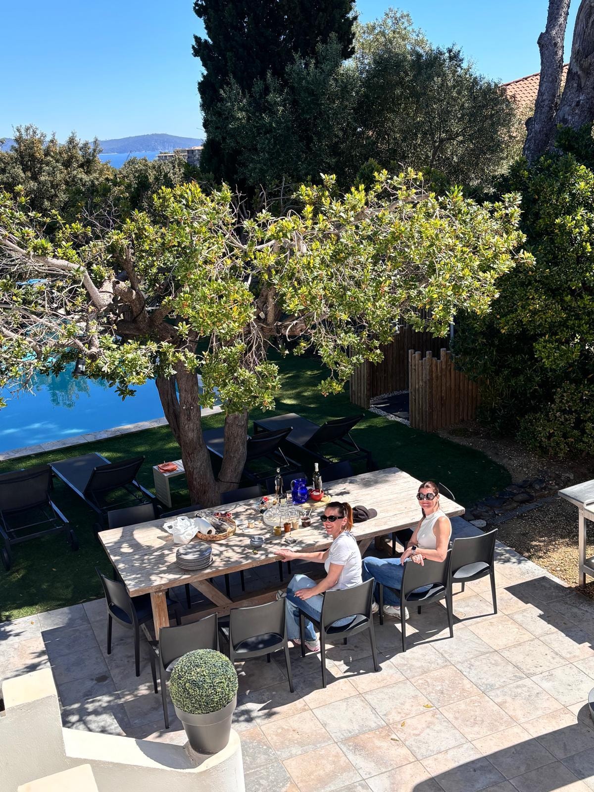 Ulkopuolella on puutarha, terassi (puutarhakalusteet) ja uima-allas (11m x 4m, jäykkä suljin - sähköinen ja turvallinen, 1 hälytys - UUSI: lämmitetty uima-allas pumpulla lämpö kauden välissä) suuntautunut kaakkois-itään, merinäköalalla.