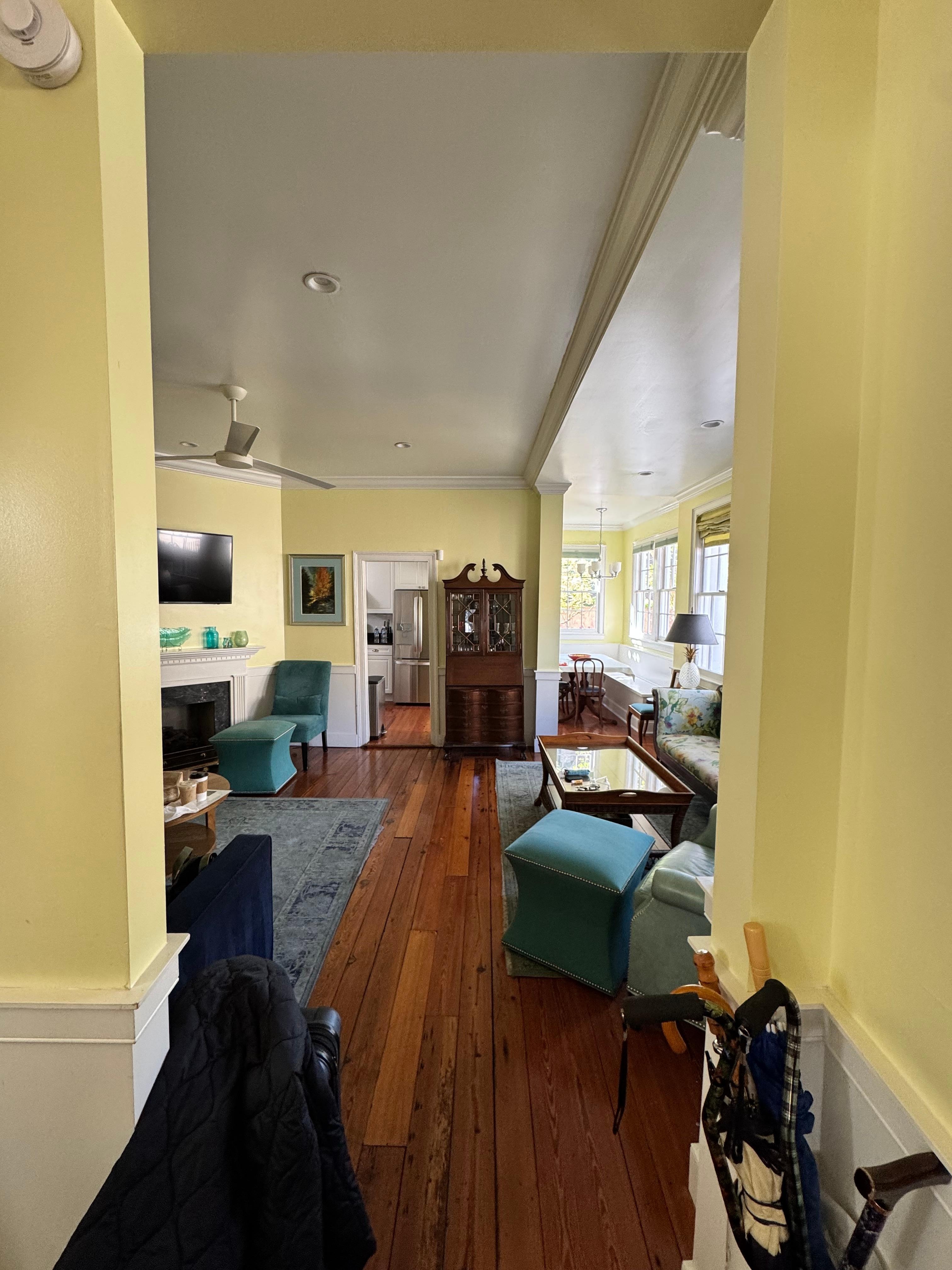 Kaksi erillistä olohuonetta. Yksi - tunnetaan nimellä ”The Den” - on perinteinen, suuri sisustus, jossa on kaksi nahkaista nojatuolia, kaunis katettu kartta Charlestonista kattoon ja antiikkiset seinäpeilit, kynttilänjalat ja lamput. Siellä on myös queen-size-vuodesohva. Toisessa olohuoneessa on moderni, valoisa sisustus, työkaasutakka, 50-tuumainen HDTV ja L-muotoinen sohva.