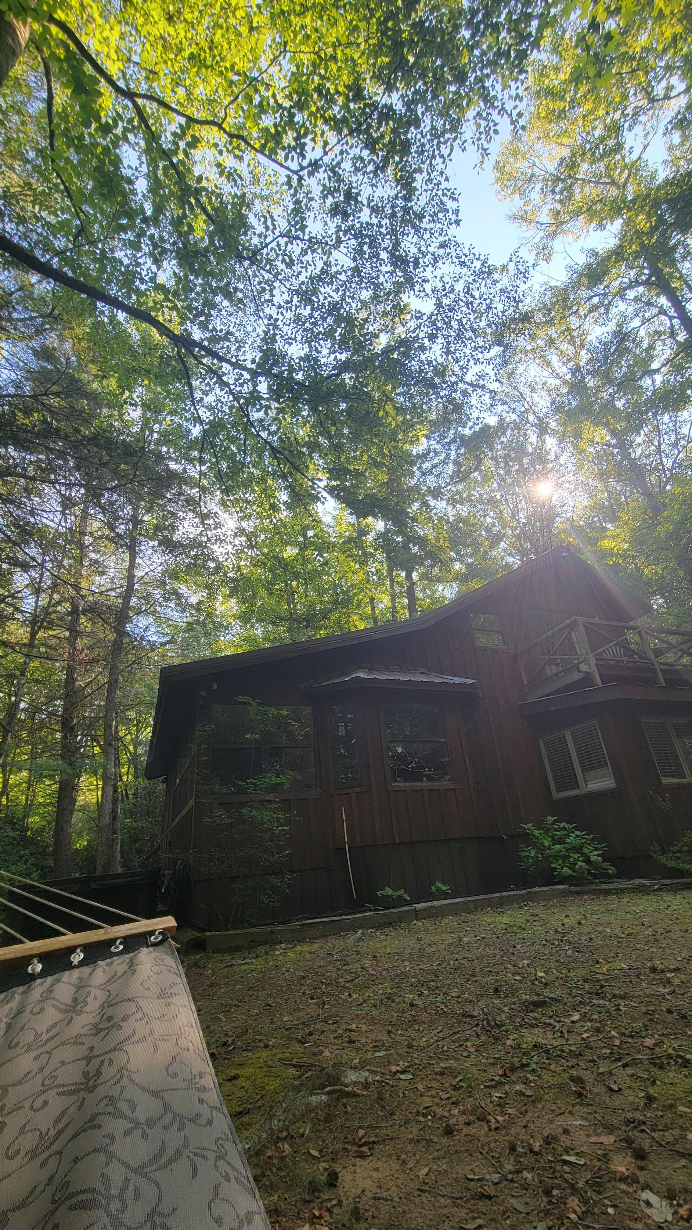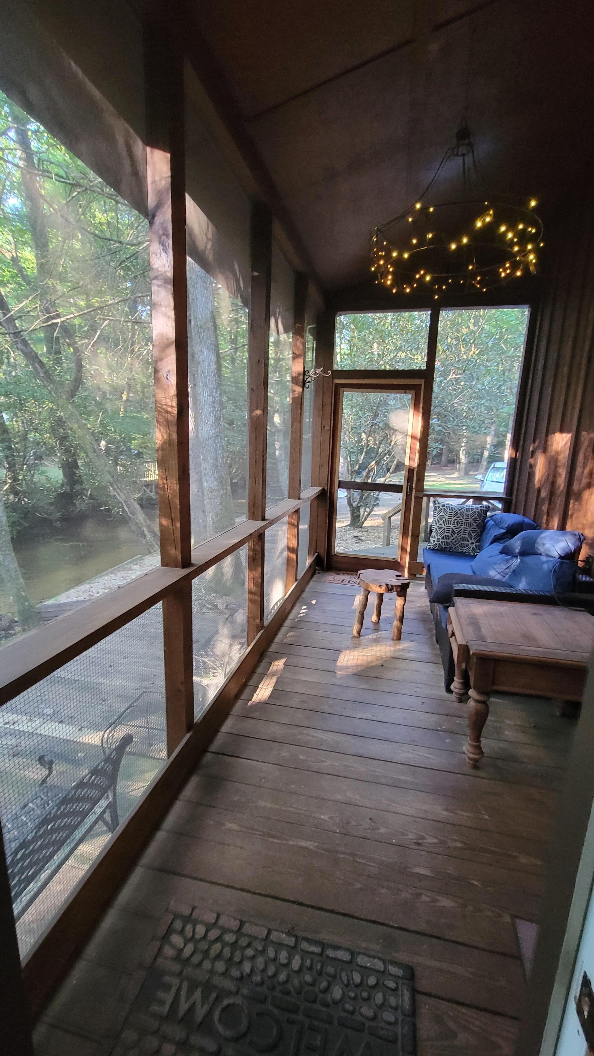 Relax on the screened porch, take a nap in the sunroom, or stretch out on the hammock while listening to the sounds of nature. Enjoy a fresh-cooked meal, a morning coffee, or an evening beverage by the creek. The cabin's great room features exposed wood, from the floors to the ceiling beams, creating a warm and inviting atmosphere. Recline on the comfy sofa, use the Wi-Fi to plan your next adventure, or challenge your kids to a video game tournament on the 65-inch flat screen TV. The cabin also offers a pool table with a view of the creek, and a fully furnished kitchen with a stainless steel oven and plenty of counter space for meal preparation.