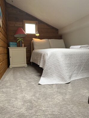 This is a 4 bedroom 2 1/2 baths and sleeps 8. The downstairs bedroom has a queen bed and a full bath attached. The upstairs has a queen bed with access to a deck overlooking the creek, a double bed, and two twin beds. The room with the double bed connects to both the room with the twin beds and queen so is ideal for families with children. There is also a half bath upstairs. It has a new kitchen with a breakfast bar and 4 bar stools and an additional full bath off of it. Open living area with dining area that seats 10 and a breakfast bar that has bar stools. The yard is large and has a dock and access to Archers Creek (the water level is dependent on the tides) which leads to the sound. Also has an outdoor shower. The house has 2 kayaks. Feel free to kayak out to the sound and go clamming with clamming rake! We have bikes, beach chairs a wagon and beach toys. (There is a golf cart rental place on the island also)