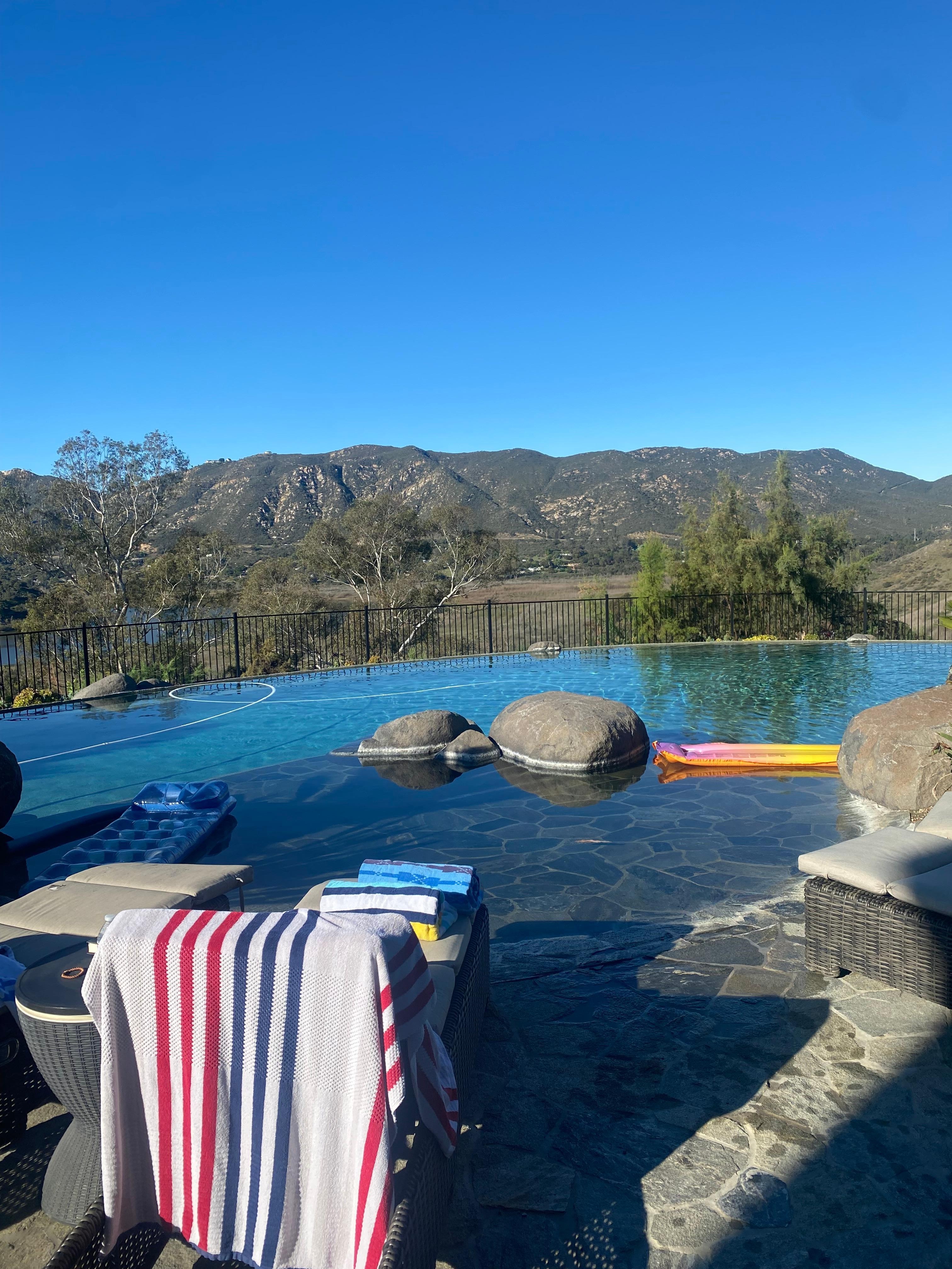 Unwind outside on the estate's lavish backyard equipped for all your relaxation needs! Soak in the radiance of the Southern California sun and take in the beauty of the mountains and Lake Hodges! Take a dip in the infinity pool or jacuzzi after a few games of basketball, volleyball, or the putting green!