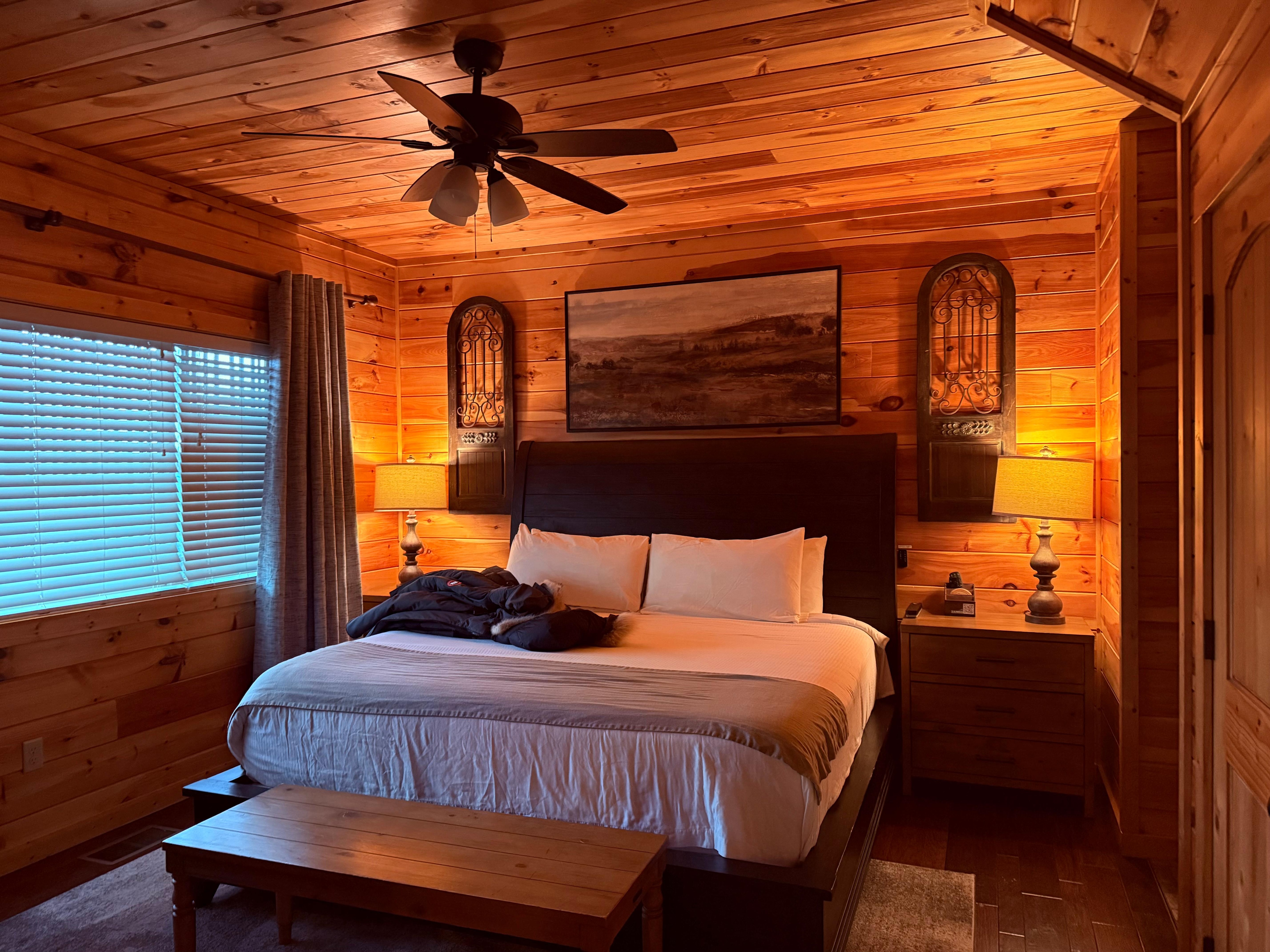 Meidän 2 makuuhuoneen luksusmökki mahtuu ryhmiin 1-6 hengelle. Pääkerroksessa Master Suite on kauniisti varustettu king size-vuode, ylelliset vuodevaatteet, 43 "LED-TV ja huoneen takka asettaa täydellisen romanttisen ympäristön. Yläkerran makuuhuoneessa on queen-size-vuode, ylelliset vuodevaatteet ja 43 "LED-TV. Olohuoneessa vetäytyvä sohva mahtuu viidennen ja kuudennen vieraan mukavasti.