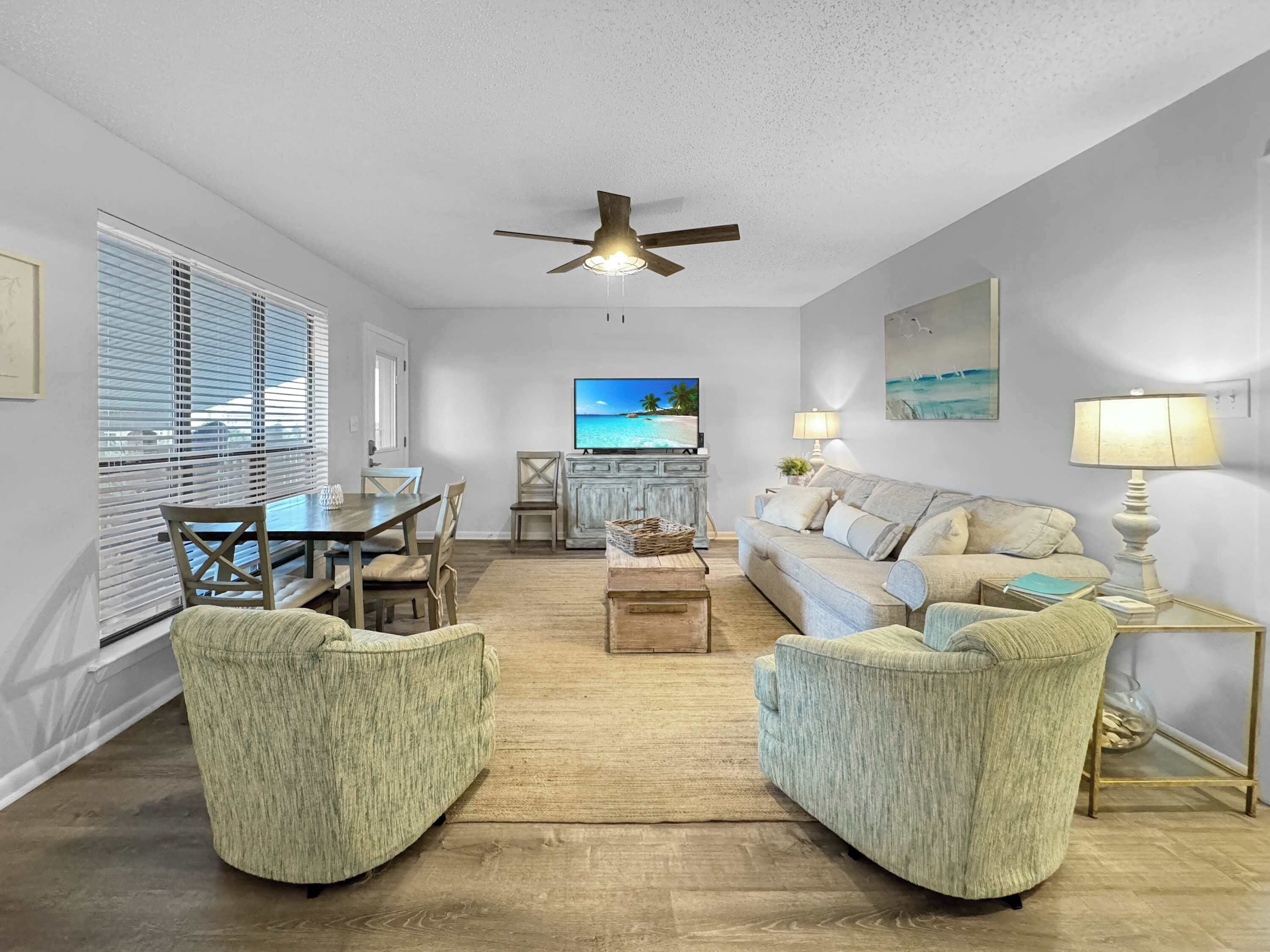 This thoughtfully designed condo features an open-concept living area with a sleeper sofa and flat-screen TV, perfect for unwinding after a day of adventure. The space includes one bedroom with a plush Queen bed and one and a half baths, complete with a tiled walk-in shower, modern barn doors, and stylish finishes. Step out onto the balcony or relax in the living room to enjoy scenic views of Little Lagoon and indirect glimpses of the Gulf of Mexico.