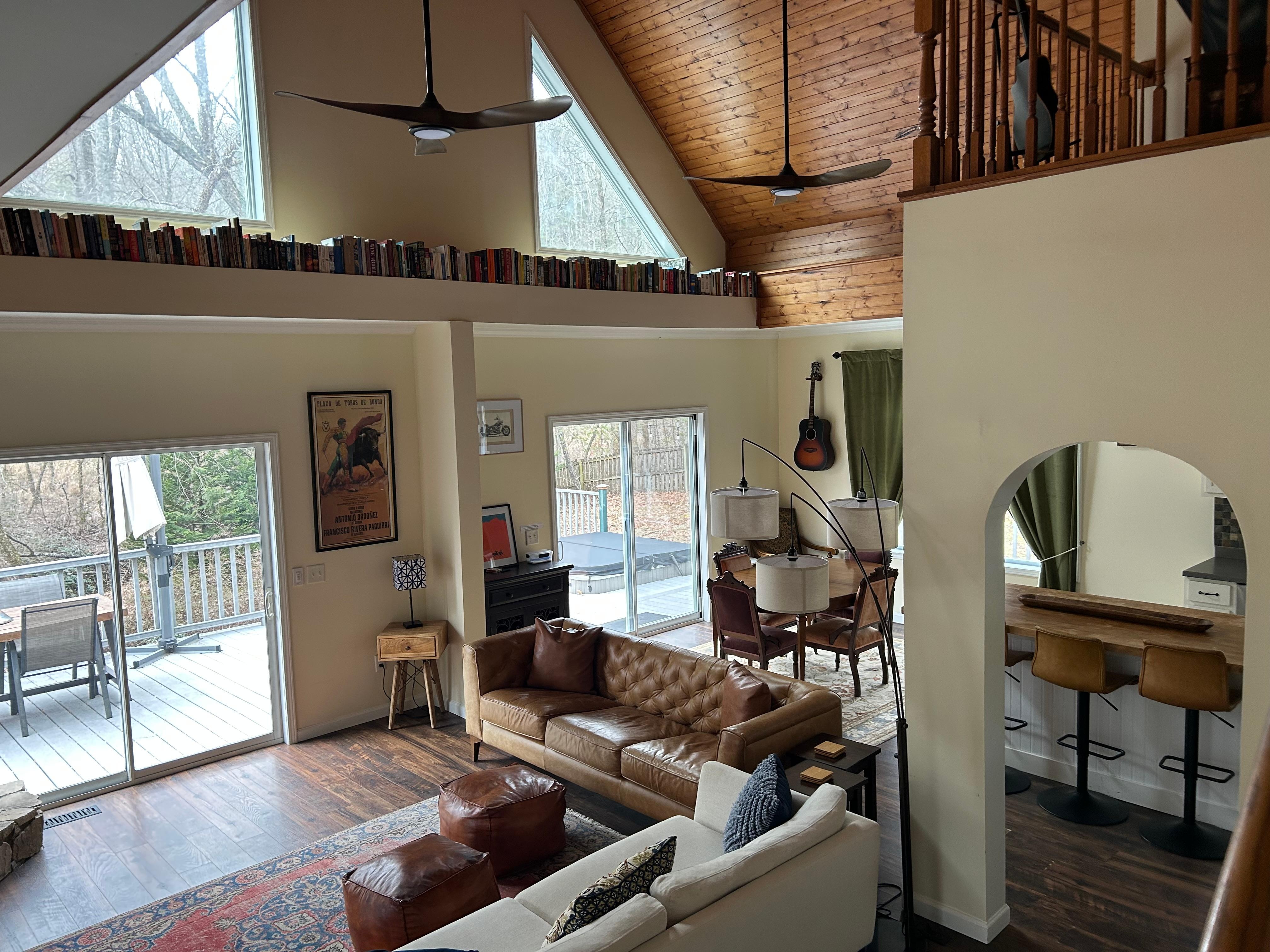 Private Sanctuary Near Hendersonville! Just fifteen miles from Asheville Regional Airport, Pleasant Grove Hideaway offers a true vacation retreat. Begin your stay by crossing a one-lane bridge over a clear mountain stream, arriving at a peaceful escape designed for relaxation. The home features a wrap-around deck with a sunken hot tub and a cozy, stylish interior. Its open layout includes a central living, dining, and kitchen area with a gas fireplace and a beautiful tongue-and-groove wood cathedral ceiling. Two bedrooms on the main level, along with additional sleeping space in the loft, ensure everyone finds comfort after a day of exploring Asheville.