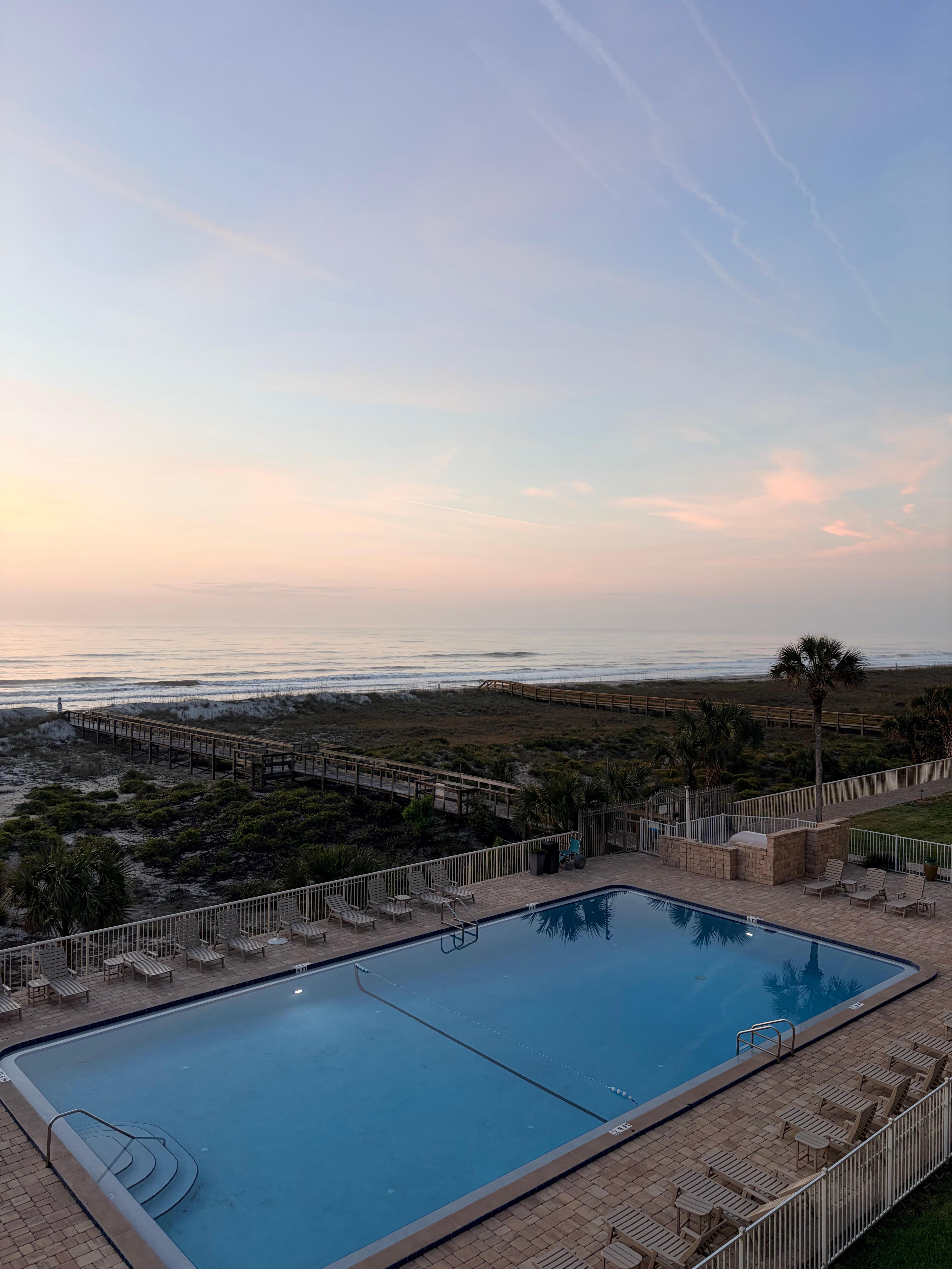 View was exceptional from nice size balcony of ocean sunrise. Pool on beachside large and clean with easy access to pier. Enjoyed views from room balcony , while at the pool after easy access to beach and from the pier !!! Family activities all around.