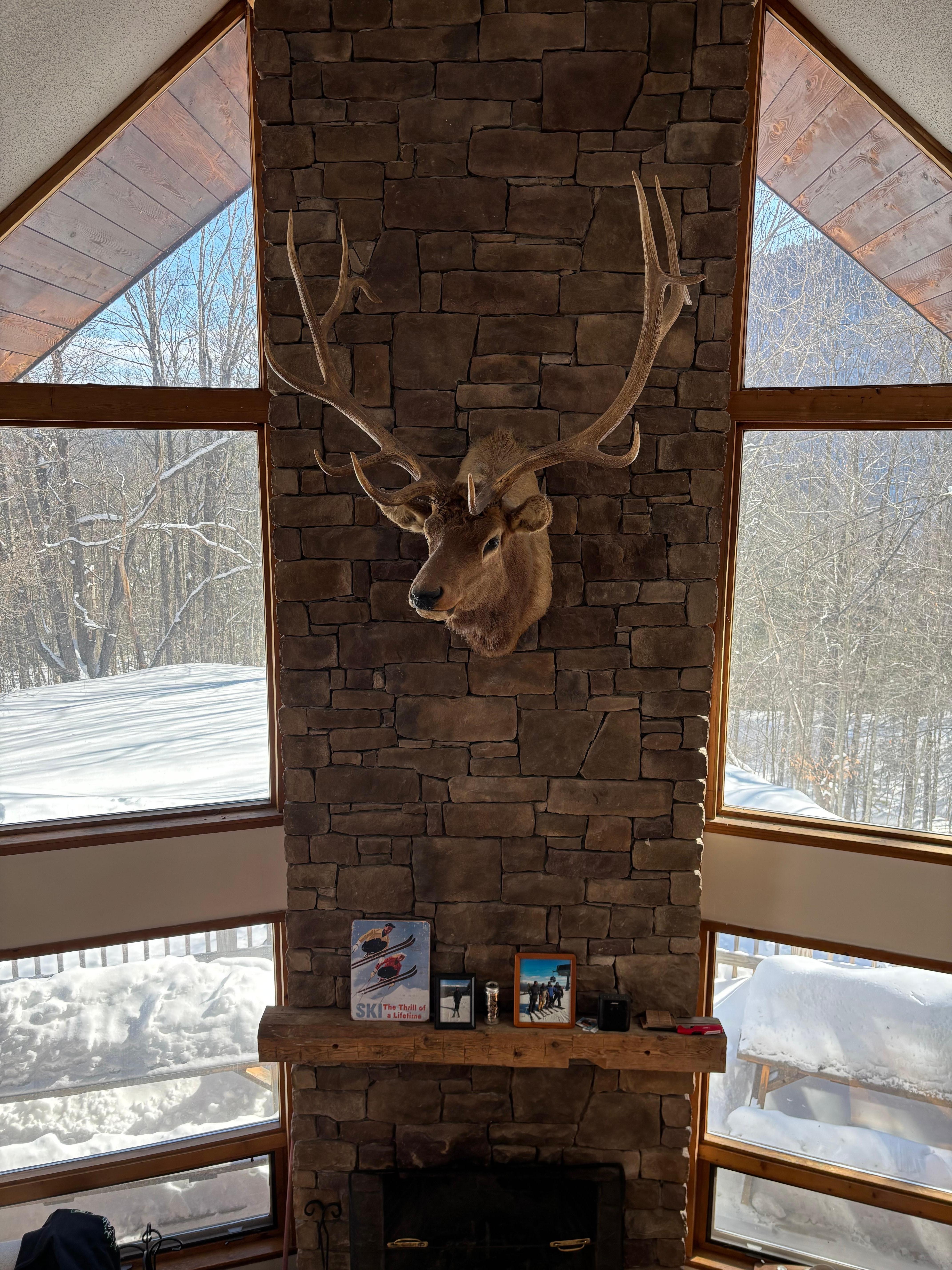 The house is vintage Vermont, with a soaring cathedral ceiling, a large, rustic stone fireplace, and a two story wall of glass facing the mountain view in the cozy main living area on the second floor. The open-concept kitchen, dining area, and main living area all blend together, so the camaraderie of meal prep, dining, or just lingering by the fire can be shared by all. The house also boasts a second living/recreation area on the first floor that adds even more fun, with a large TV, drink fridge, wet bar, and a handcrafted wood counter that’s perfect for snacks, games, or a quick check of your emails. It can be a place for the whole family to hang out, or a separate space for the kids to call their own.