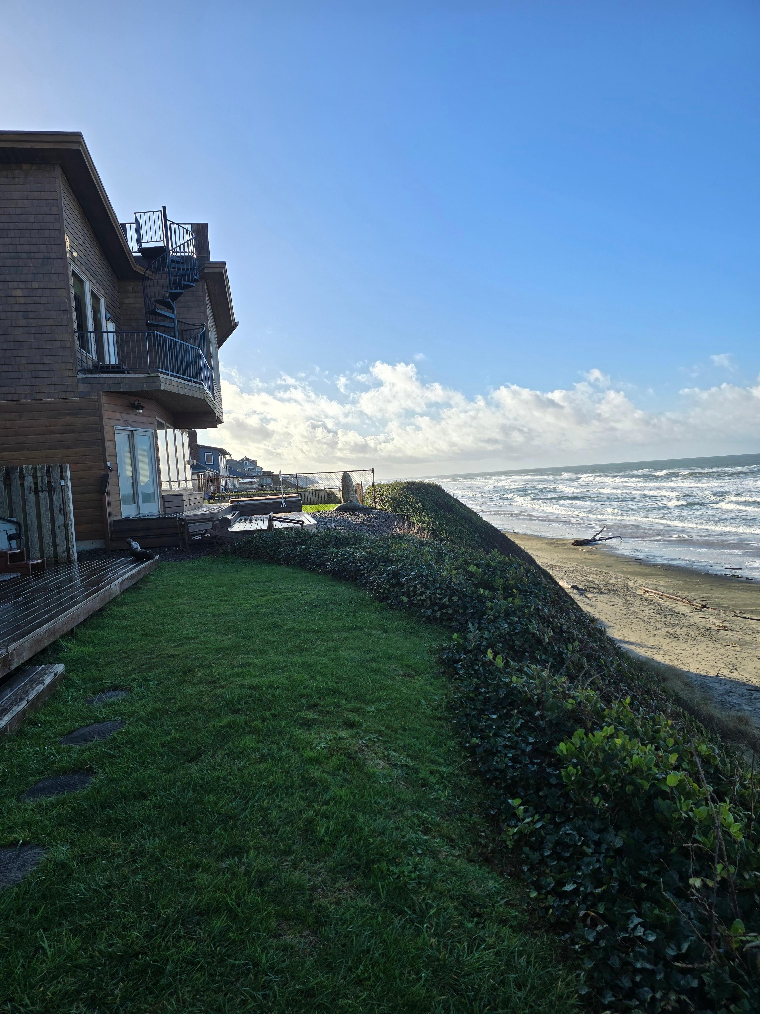 Fabulous 1940’s cottage oceanfront on the beautiful Pacific Ocean. This is a two story home that sleeps 6-8 people with 1 king bed in the master suite, 2 queen beds in each of the other two bedrooms, a futon in the separate sitting room and 2 over sized sleeping pads. The upstairs Master Suite is a romantic retreat with a spectacular ocean view, a separate sitting area, fireplace and its’ own private bathroom (shower only). Two additional bedrooms are located on the main floor, one also boasting a spectacular ocean view and both sharing the second spacious bathroom (shower only). A relaxing Hot Tub on an oceanfront deck, Hi Speed Internet with Wi-Fi, 2 HD TVs (39 inch LCD TV, 30' & 19” LCD TVs), 2 CD players, Play Station w/ 8 Games and a small library.