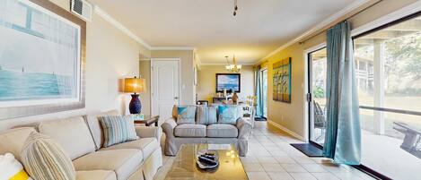 Step inside to an open, airy layout with fresh finishes, new flooring, and coastal-inspired decor throughout. The living area is perfect for lounging after a beach day, and the fully stocked kitchen makes it easy to cook in or enjoy morning coffee on your private balcony. The bedroom features a comfortable queen bed and the bathroom has been beautifully updated with modern touches.