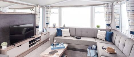 Inside, the property offers a thoughtfully designed layout where you can settle in and relax after a day of adventures. The living area features comfortable sofas where you can enjoy movie nights, or plan your next outing. A large window brings in plenty of natural light, creating a bright and welcoming atmosphere throughout.