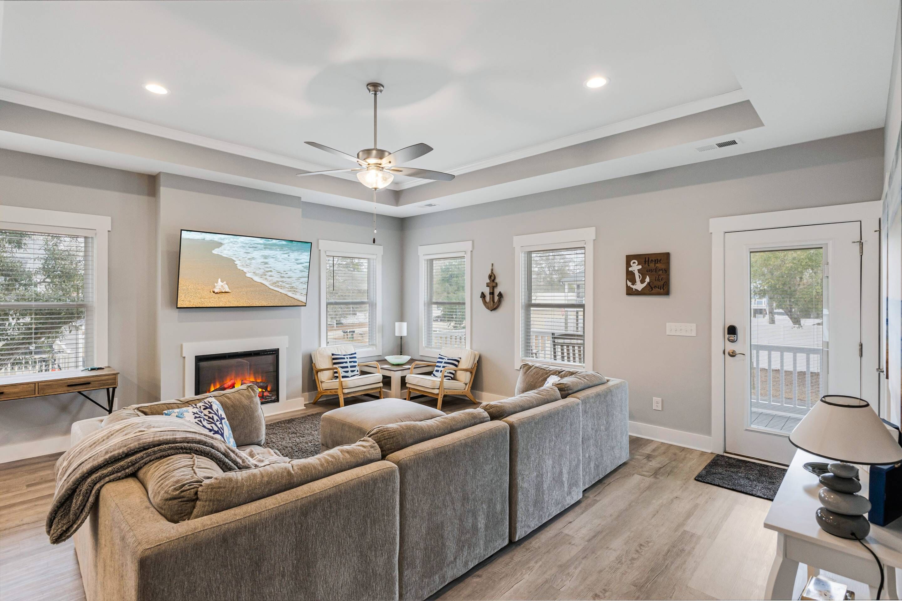 The kitchen is designed as the central hub of activity. It seamlessly connects to both indoor and outdoor living areas, making it the ideal spot for meal preparation, casual dining, and socializing. Equipped with modern appliances and ample counter space, it caters to both seasoned cooks and casual entertainers. With fashion lighting, coffered ceilings, and saturated pops of color against a neutral background, this beach cottage features vibrancy and personality to every room, creating a cheerful and lively vacation experience.