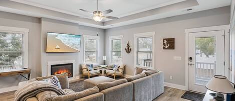 Living Room: hand painted mural feature wall, comfortable sectional sofa, Smart TV, ceiling fan/light. Dining table seating 5.