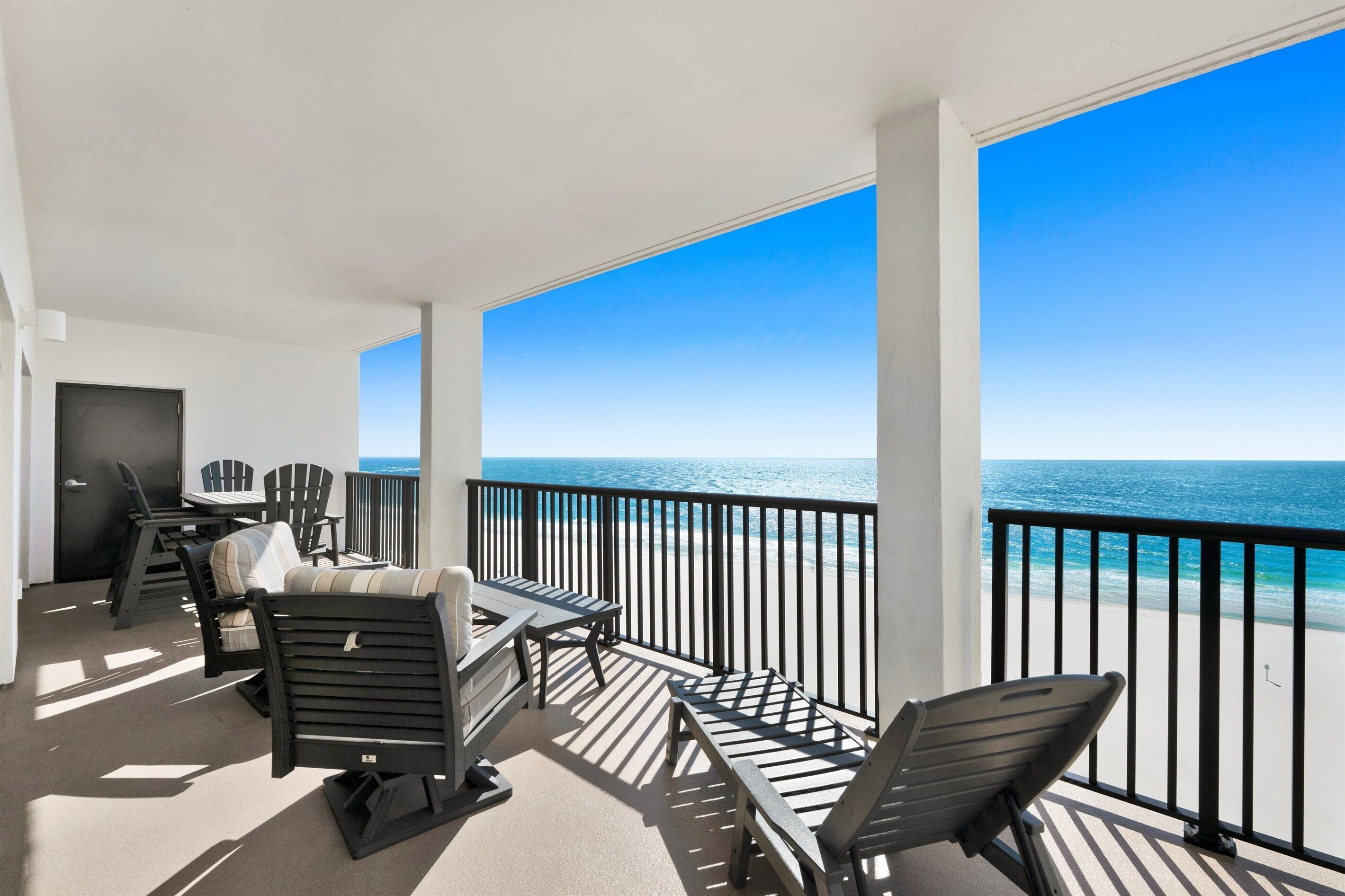 The spacious living room features a comfortable queen size sleeper sofa, a 60' 4k HD smart TV and a DVD player. Both the living room and master bedroom open directly onto the large wrap-around balcony which offers spectacular views of the white sandy beach and the beautiful turquoise water of the Gulf of Mexico. This corner unit gets wonderful natural light and captures panoramic views. The balcony features Pollywood Adirondack table and chairs, creating a comfortable and tranquil lounging space.