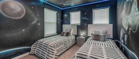 When it’s time to rest up for a day of Orlando fun, every bedroom in this home is a great place to get a good night’s sleep. Guests can pick and choose from two king bedrooms, a full bedroom or two twin bed options that are ideal for little ones! Adding to the fun is the fact that one of the twin bedrooms is fully space themed while the other features Disney princesses! Each bedroom has its own private bath as an added convenience.
