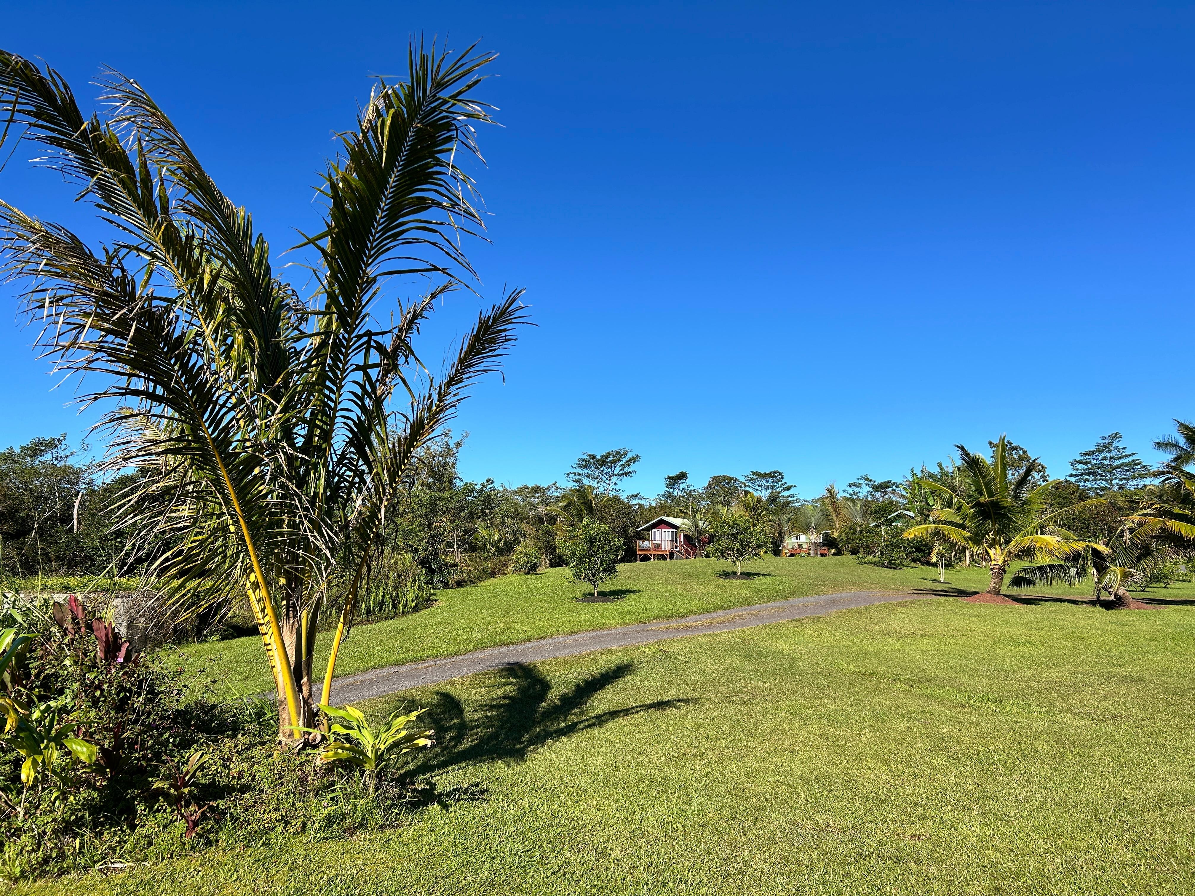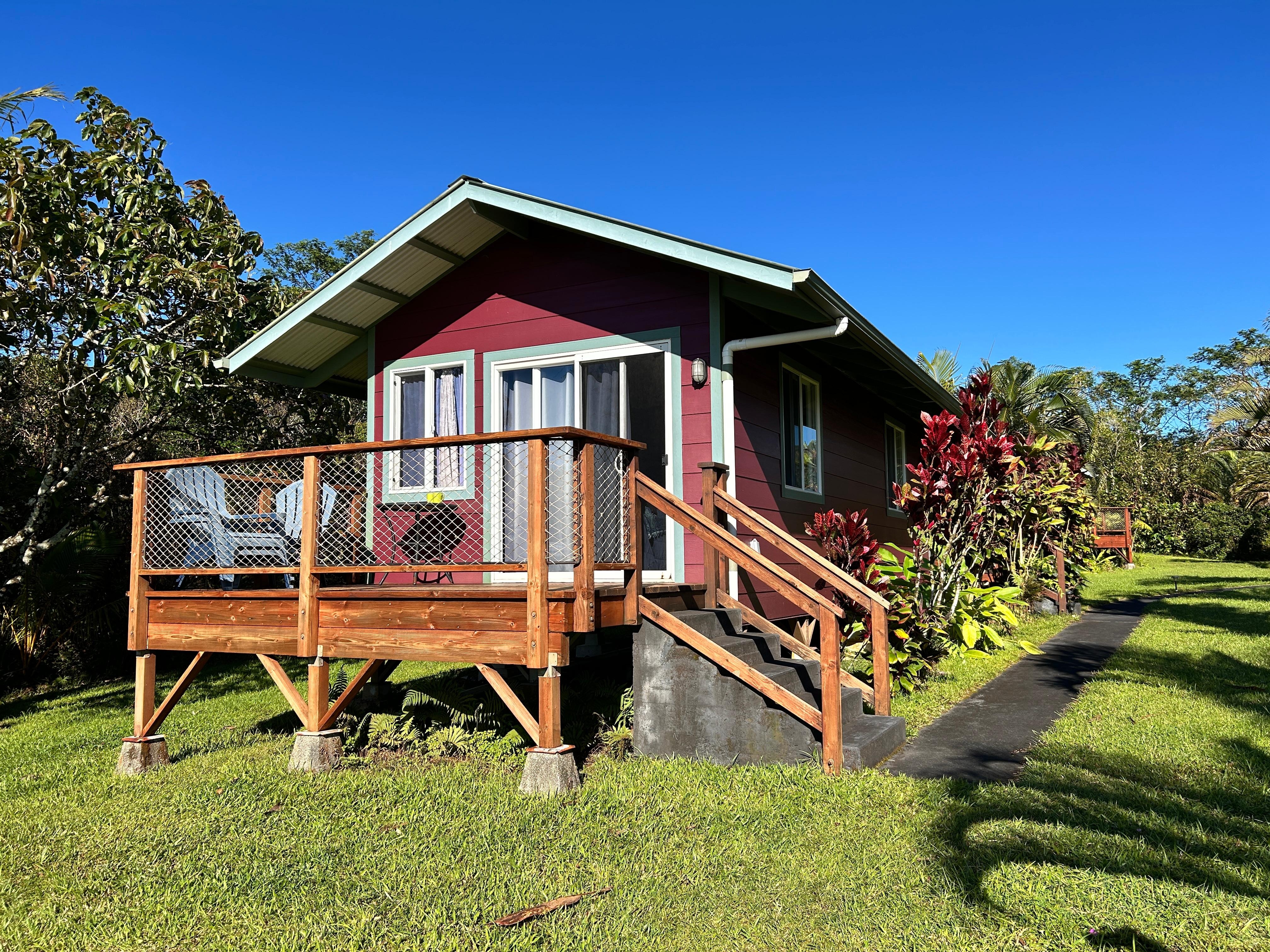 The Purple Passion Cottage is located on a serene 20 acre estate with beautiful ocean and meadow views. The cottage is cozy and equipped kitchenette (range, oven, mini-fridge/freezer, microwave), full bathroom and two bedrooms. The main bedroom has a king bed with an attached ocean-view lanai. The second bedroom doubles as a living room with one twin bed or two depending on the number of people staying. Enjoy the pool, rainforest trail, steam vents, volcanic hot spring tubs and private retreat setting.