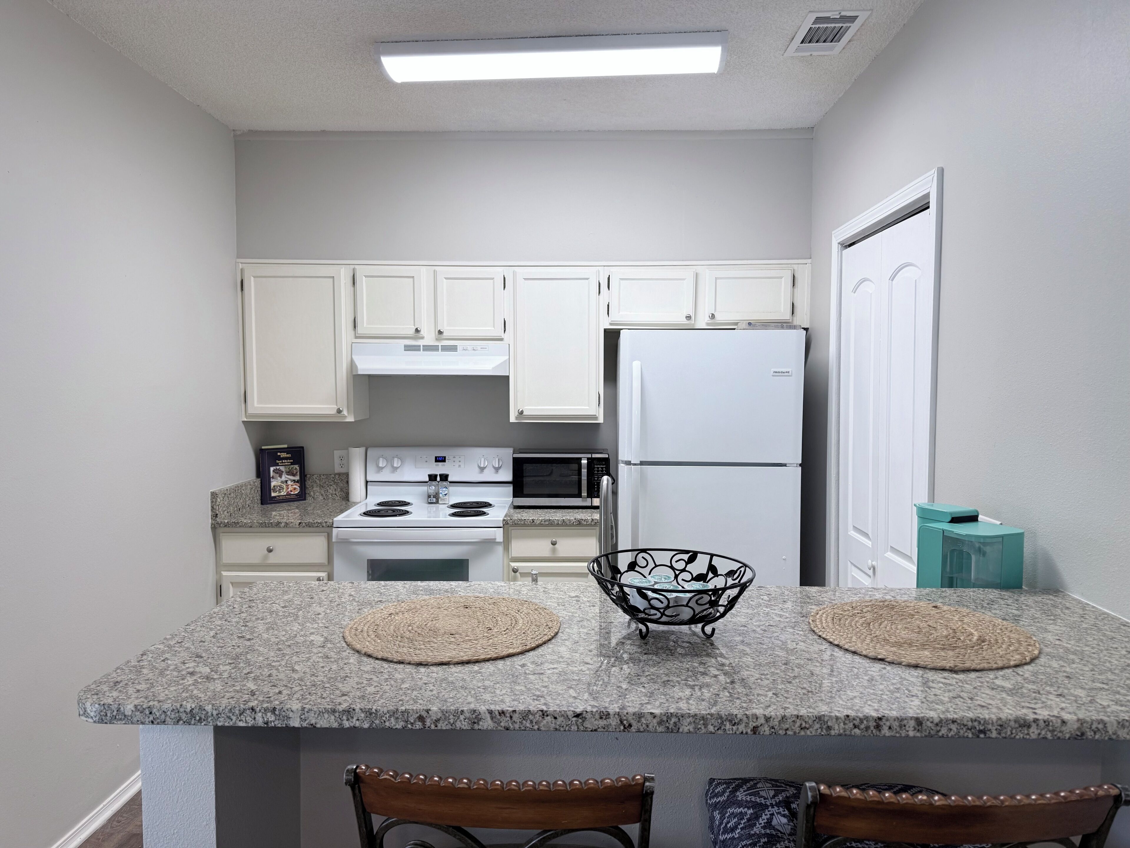 Ilmastoitu koti, jossa asiakkaille on tarjolla keittiö, pyykinpesukone ja 2 kylpyhuonetta