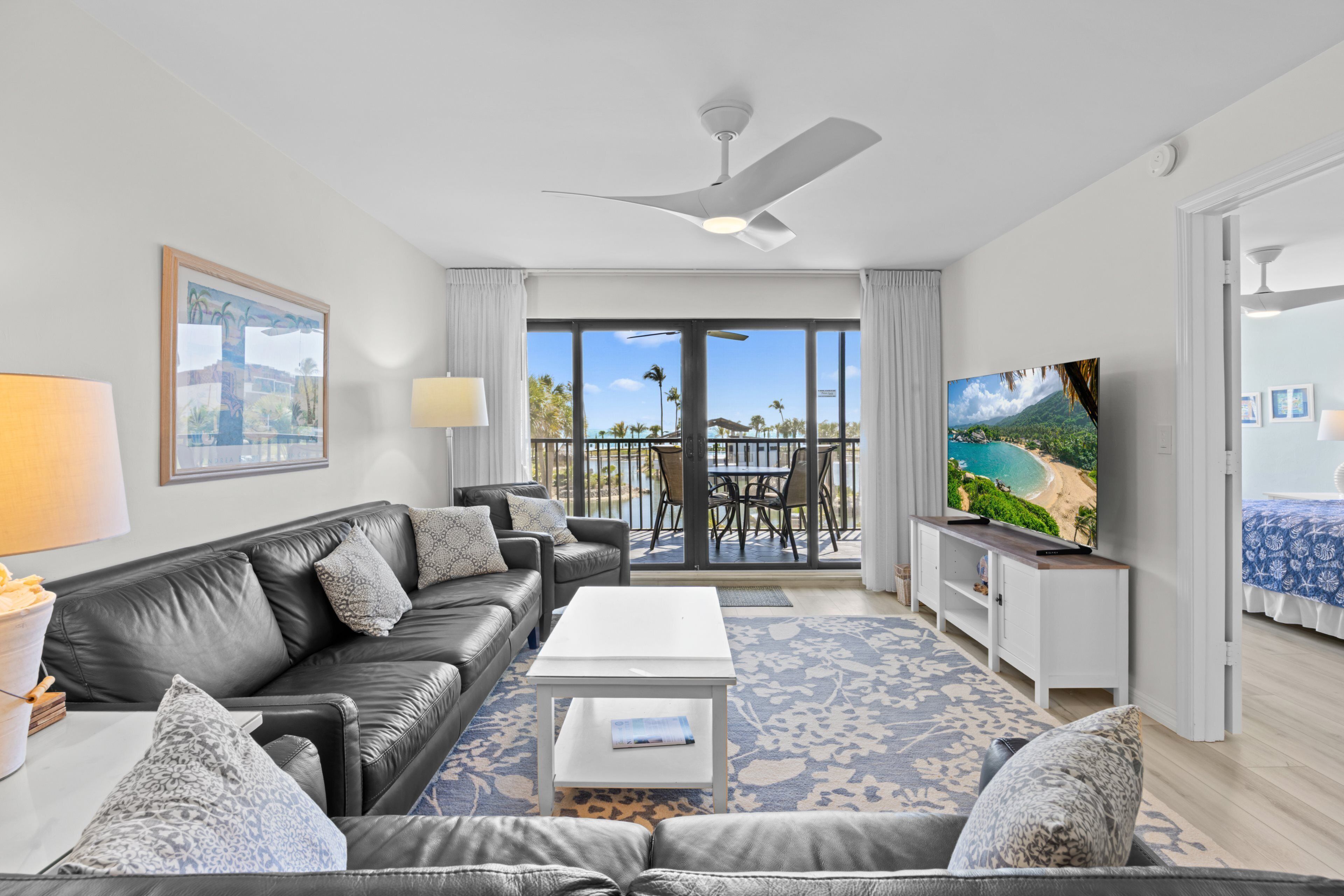 Living Area: An open-concept living, sleeper sofa, and dining area with comfortable seating, a flat-screen TV, and breathtaking views of the Gulf of Mexico.