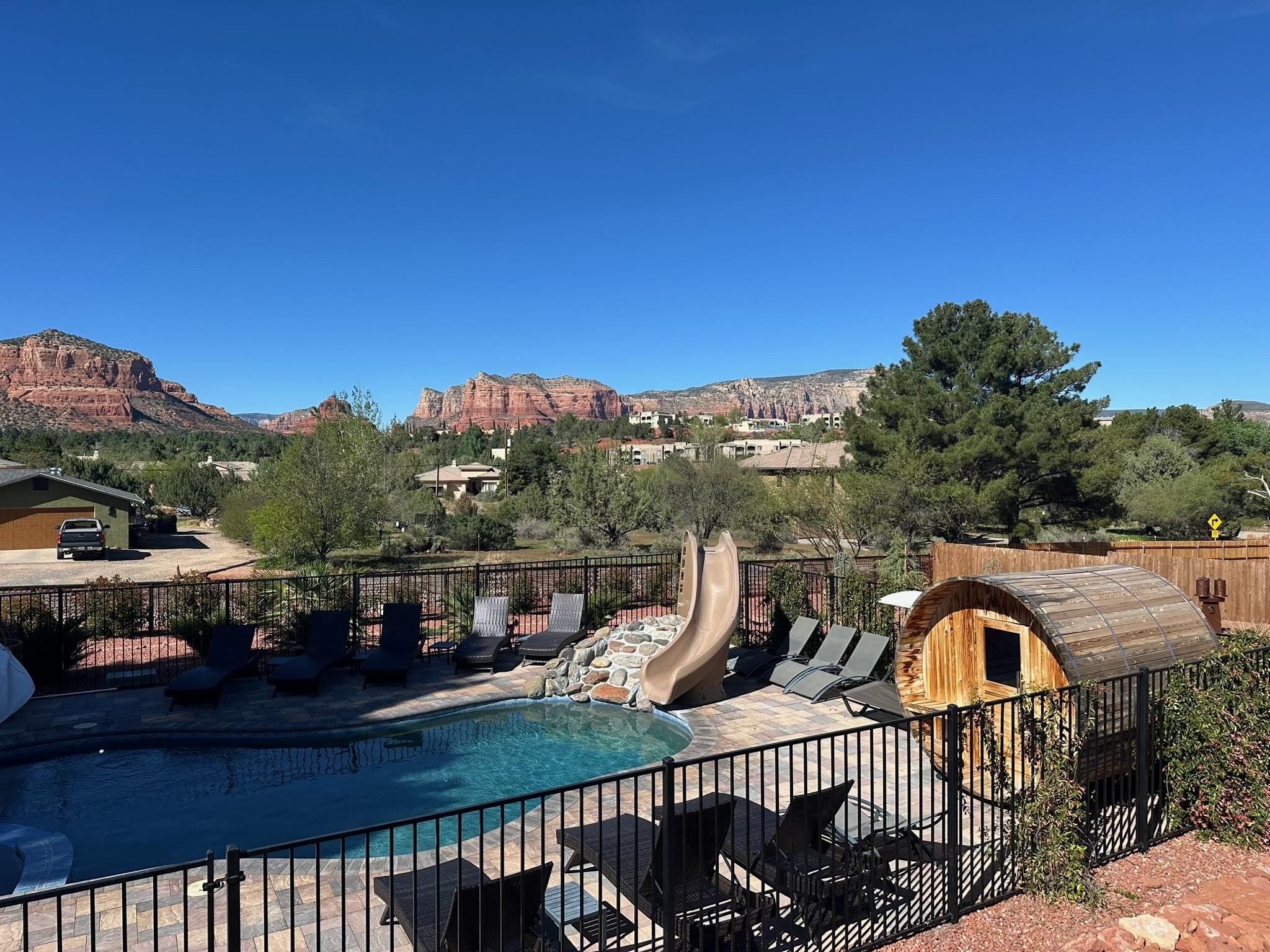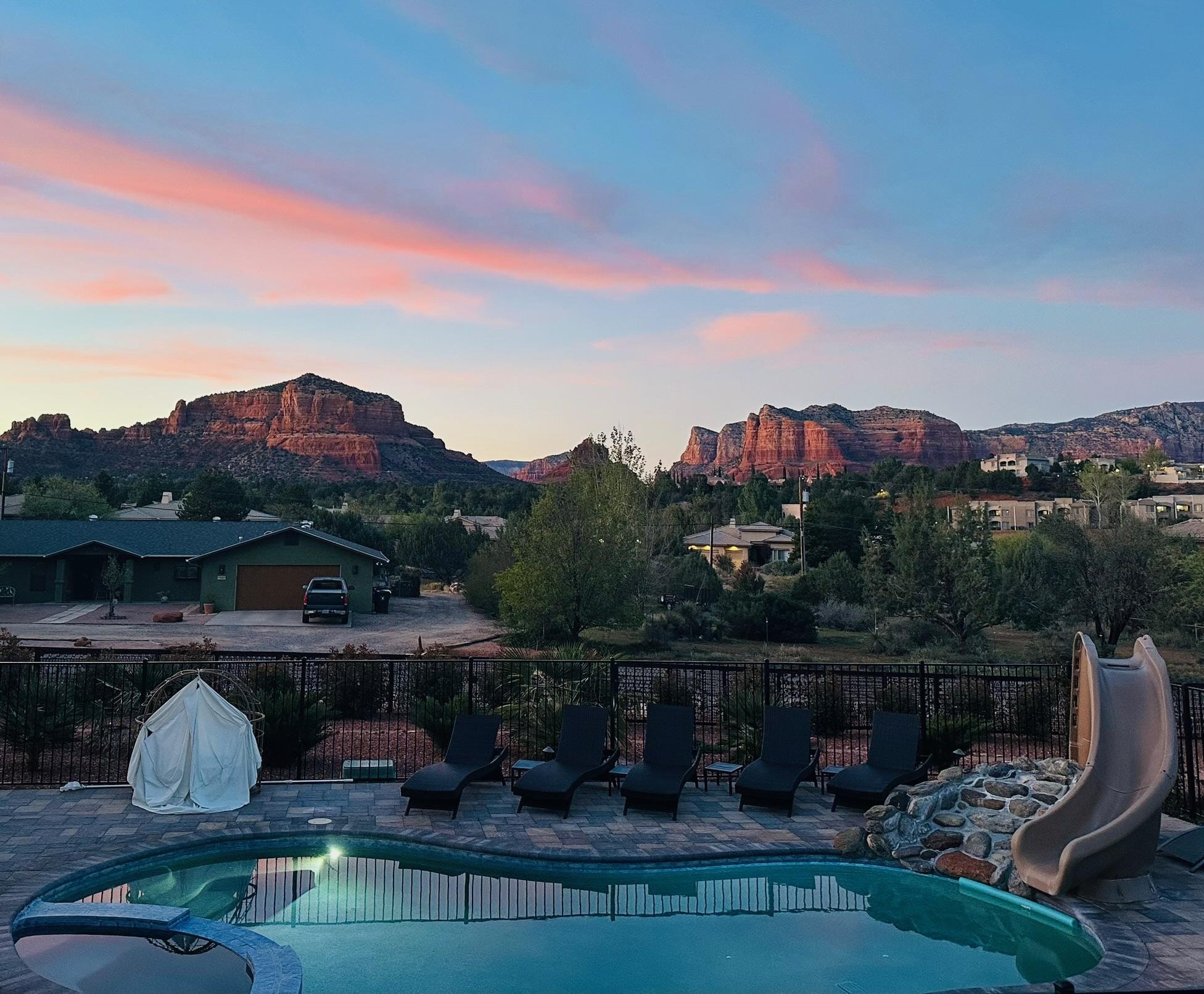 An exquisite 8-bedroom, 4.5-bath estate in Sedona’s Village of Oak Creek, where luxury meets nature on a sprawling one-acre retreat. This home is thoughtfully designed for unforgettable stays, it’s the perfect setting for retreats, reunions, and group getaways. Whether you’re unwinding in the heated pool, meditating in the garden, or exploring nearby hiking trails, golf courses, and top-rated dining, this home offers the perfect balance of serenity and adventure!