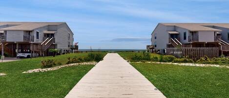 Welcome to "Ocean Mile H-4"! This beachfront townhome features 2 bedrooms and 2.5 bathrooms. The living area features an oversized sectional, TV and direct access to a beach front balcony. The kitchen is well stocked, equipped with white appliances, a breakfast bar that seats 2 and a kitchen table that seats 4. A half bath can be found directly off of the kitchen. One bedroom features a twin over queen bunkbed. A neighboring bathroom features a walk-in shower. The master suite features a king bed, ensuite bathroom with double vanity, soaking tub and a private balcony overlooking the Gulf of Mexico.