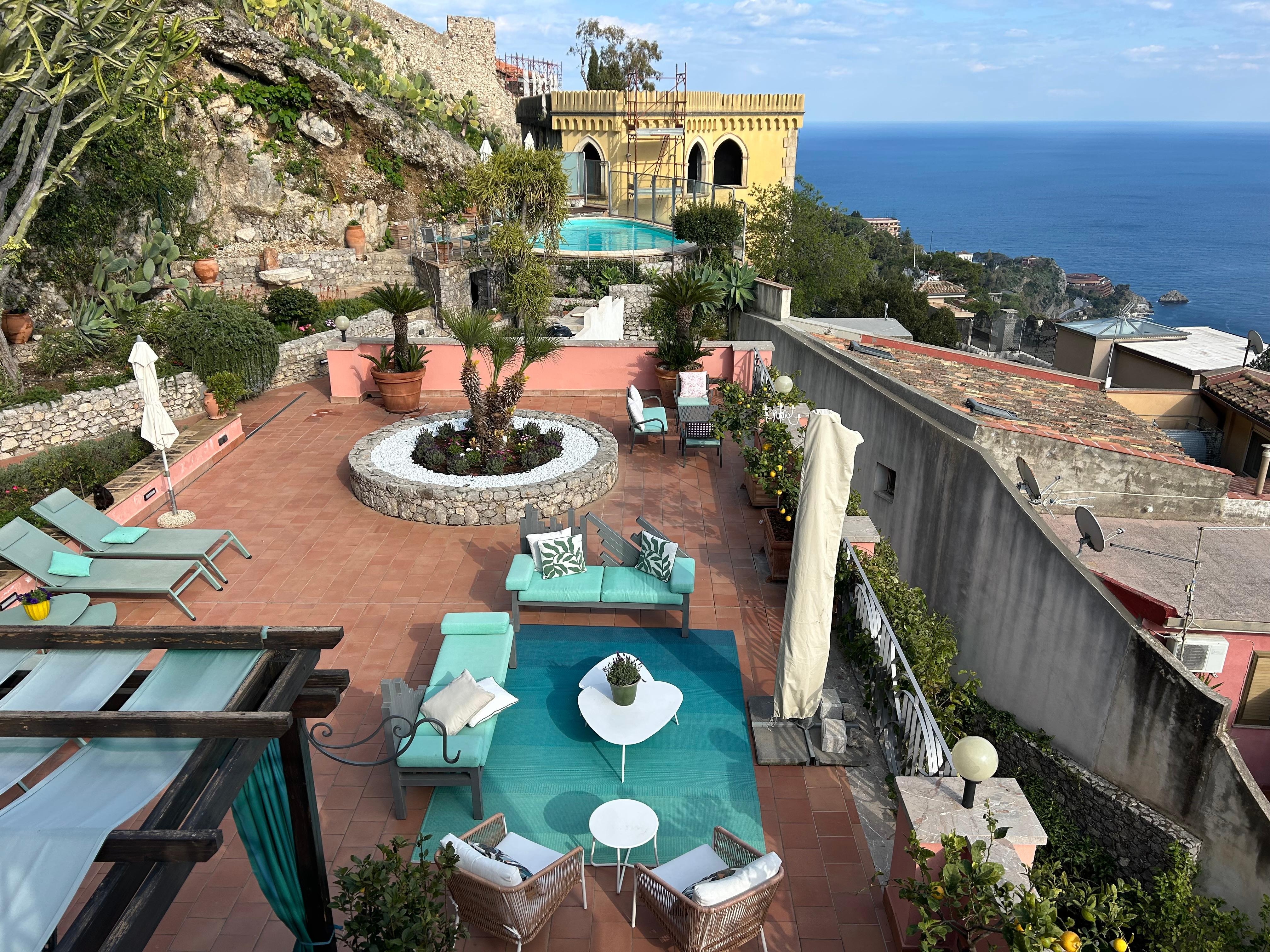 The fourth terrace is 65 square meters (700 square feet) large. It features an above-ground heated jacuzzi pool with hydromassage with six seats. The jacuzzi pool is open from the beginning of April until the end of October. You will reach it from the third terrace going down approximately 16 stairway steps. It is partly shaded by trees. It is equipped with a table and chairs. From the terrace you will enjoy a lovely view of the Mount Etna and of the sea.