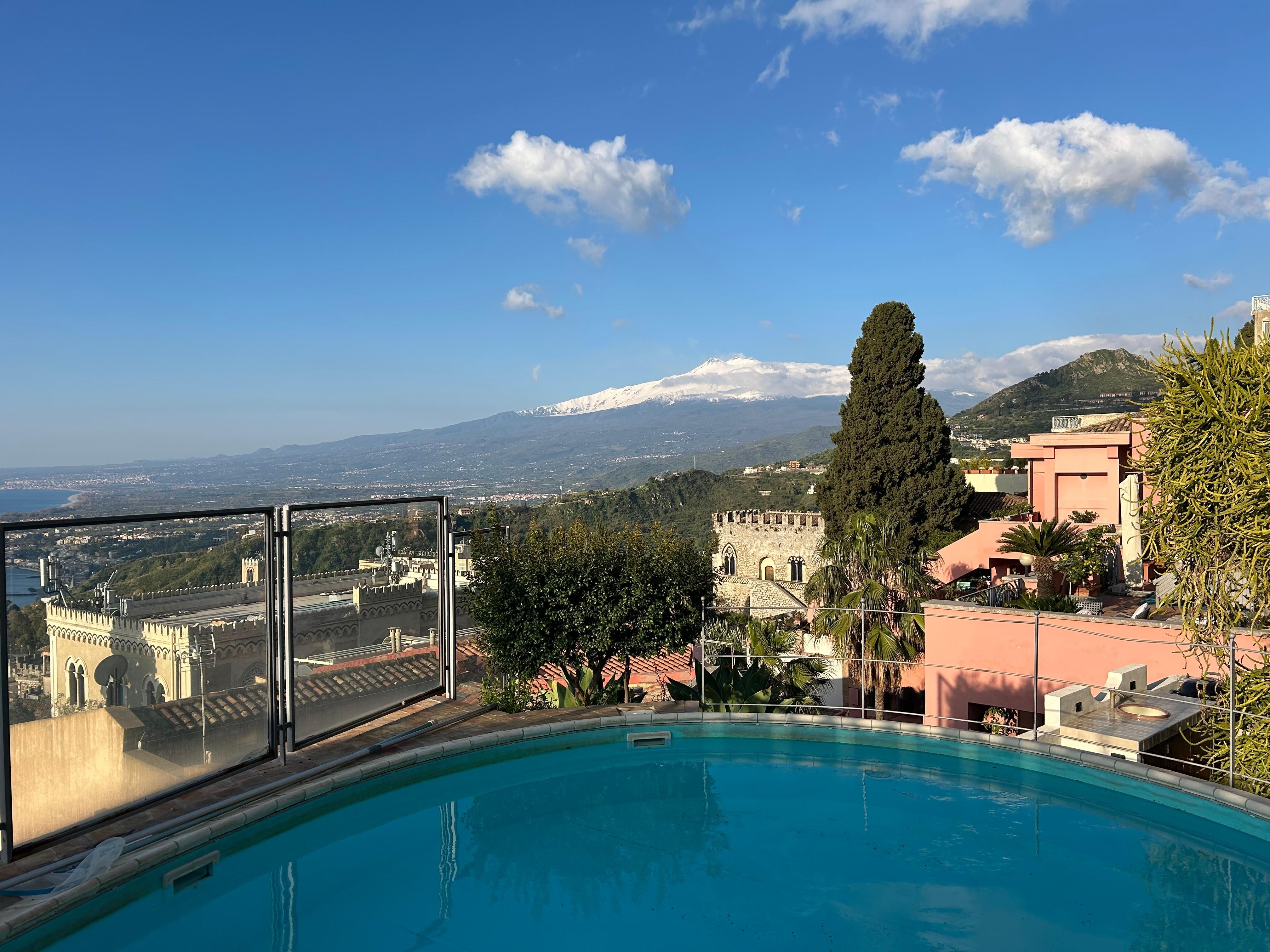 You will reach the swimming pool from the first terrace going up approximately ten stairway steps. The pool is 5 meters (16 feet) large by 8 meters (26 feet) long, 1.3 meters (4.3 feet) deep. The swimming pool has a sinuous shape. The area is equipped with sun loungers and an external shower. From the swimming pool you will enjoy a fascinating view of the Mount Etna and of the sea. The pool is open from the beginning of March until the end of November.