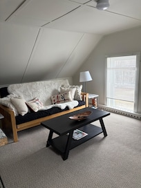 The apartment is very cute, the kitchen has everything you need, and the beds are very comfortable. As mentioned in other reviews the bathroom is extremely small with the toilet in an awkward position and a sink so small you will get more water on your feet when washing your face. The two sets of stairs are very, very steep and small, and there is nothing blocking the opening at the top so not the best for very young children. The location is great, very convenient for skiing at Stowe and we also took a ride down to Barre and Montpelier. There is another apartment and you can hear through the walls, we had neighbors that were singing loudly after 9pm unfortunately.