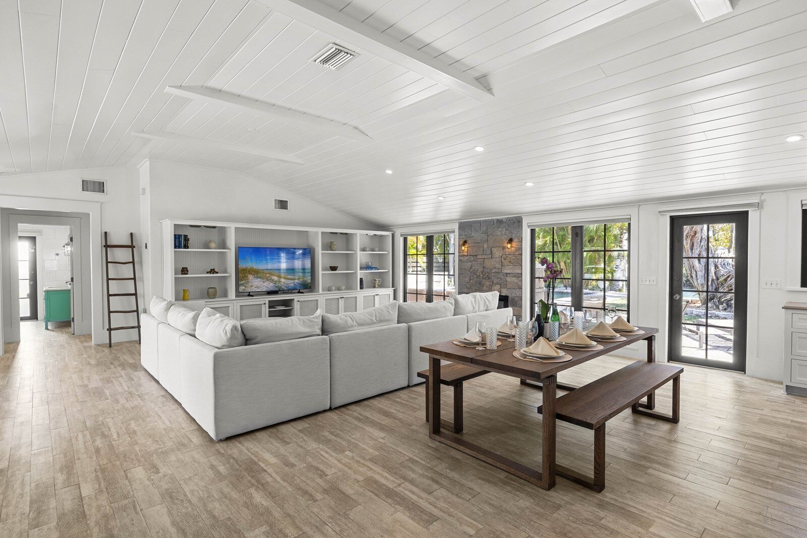 The backyard at Banyan Manor delivers the full resort experience. Lounge by the sparkling pool with an in-ground spa and waterfall, or spend your day on the shaded patio with plush seating. Fire up the built-in BBQ grill for a fresh seafood feast and dine outside at the outdoor dining table with a convenient fridge. Challenge friends to a game of ping pong or pool while watching the big game on the outdoor TV. With a private dock just steps away, guests can fish, launch kayaks, or set out to explore the waters of Anna Maria Island.