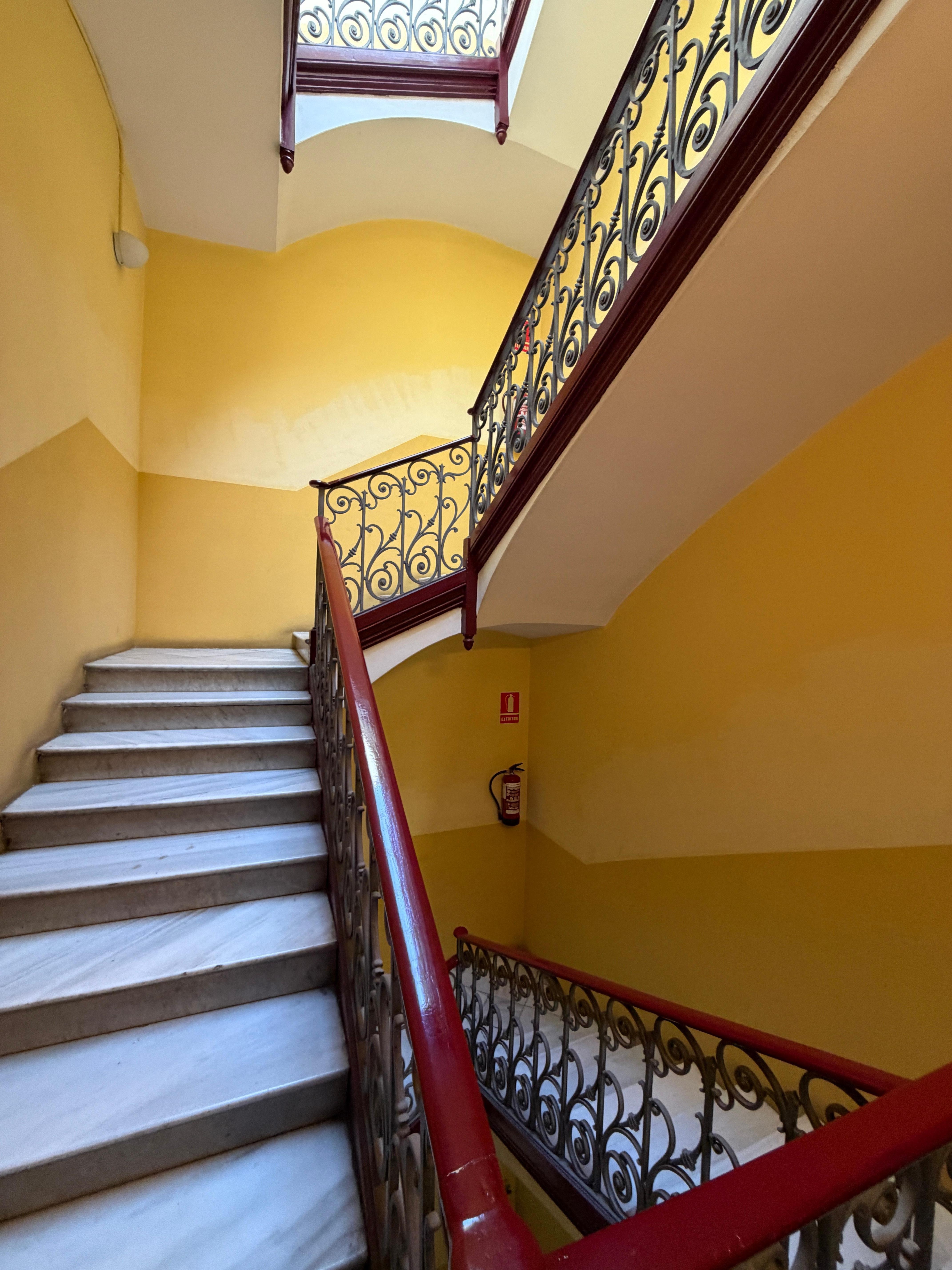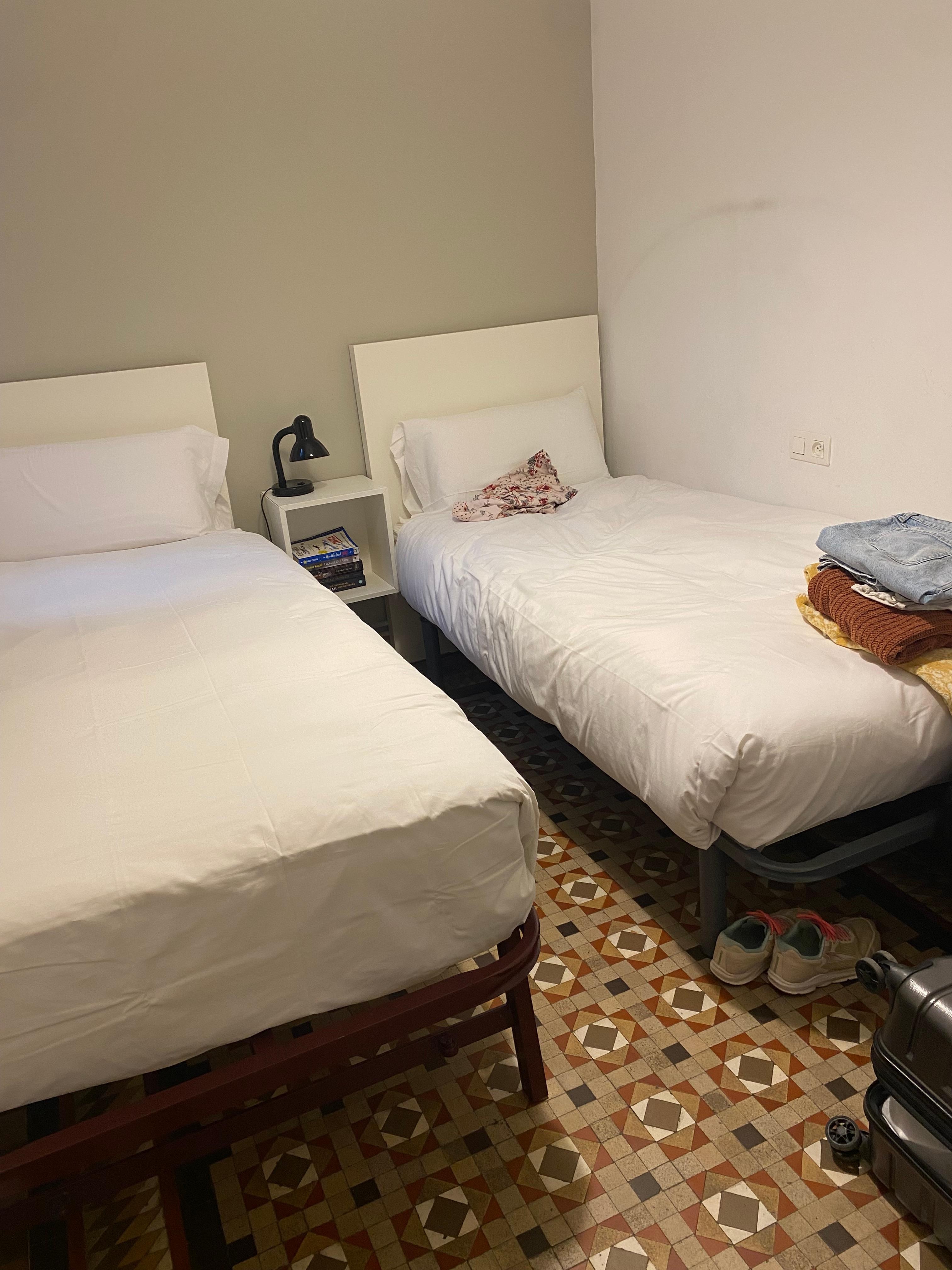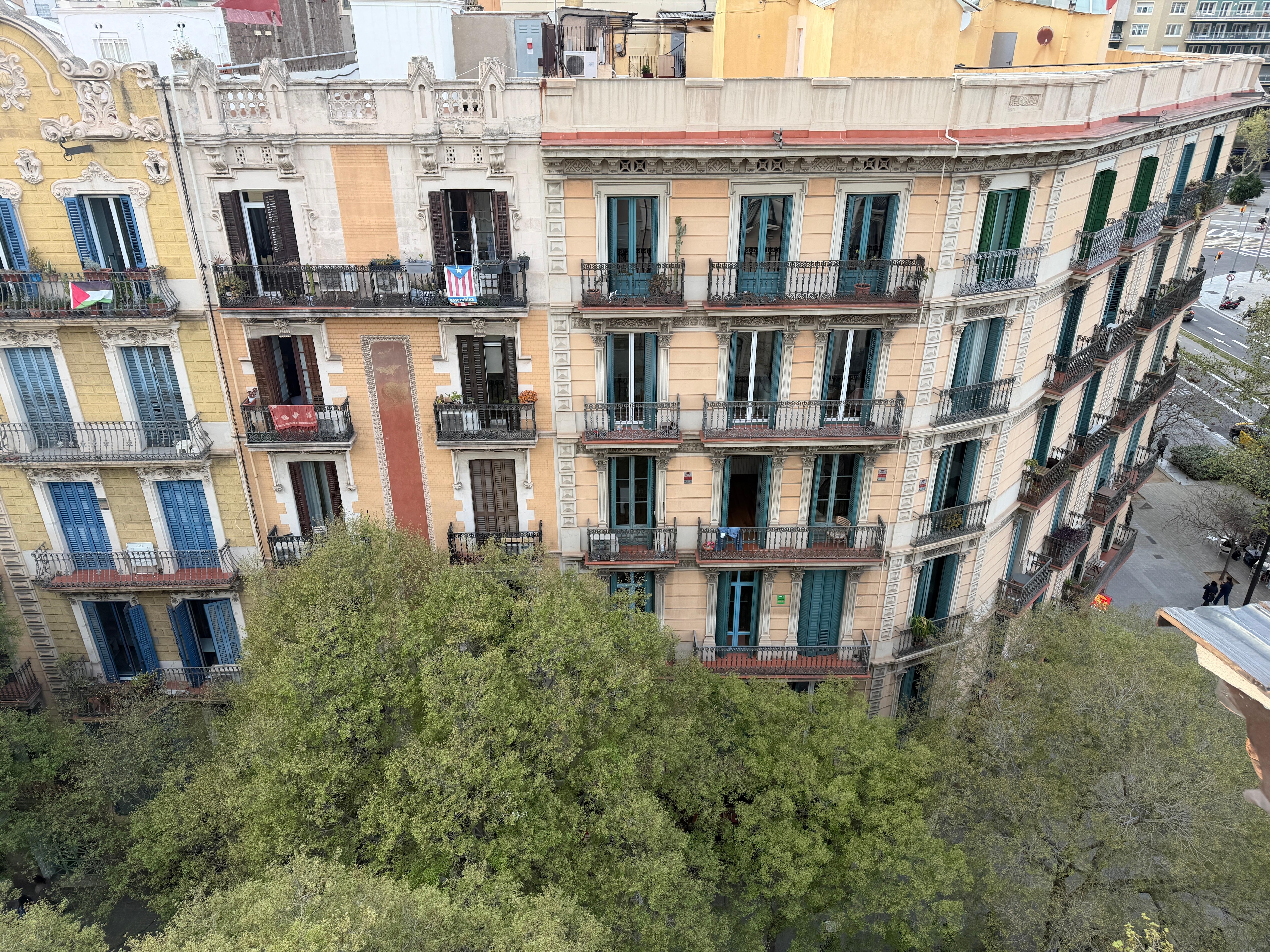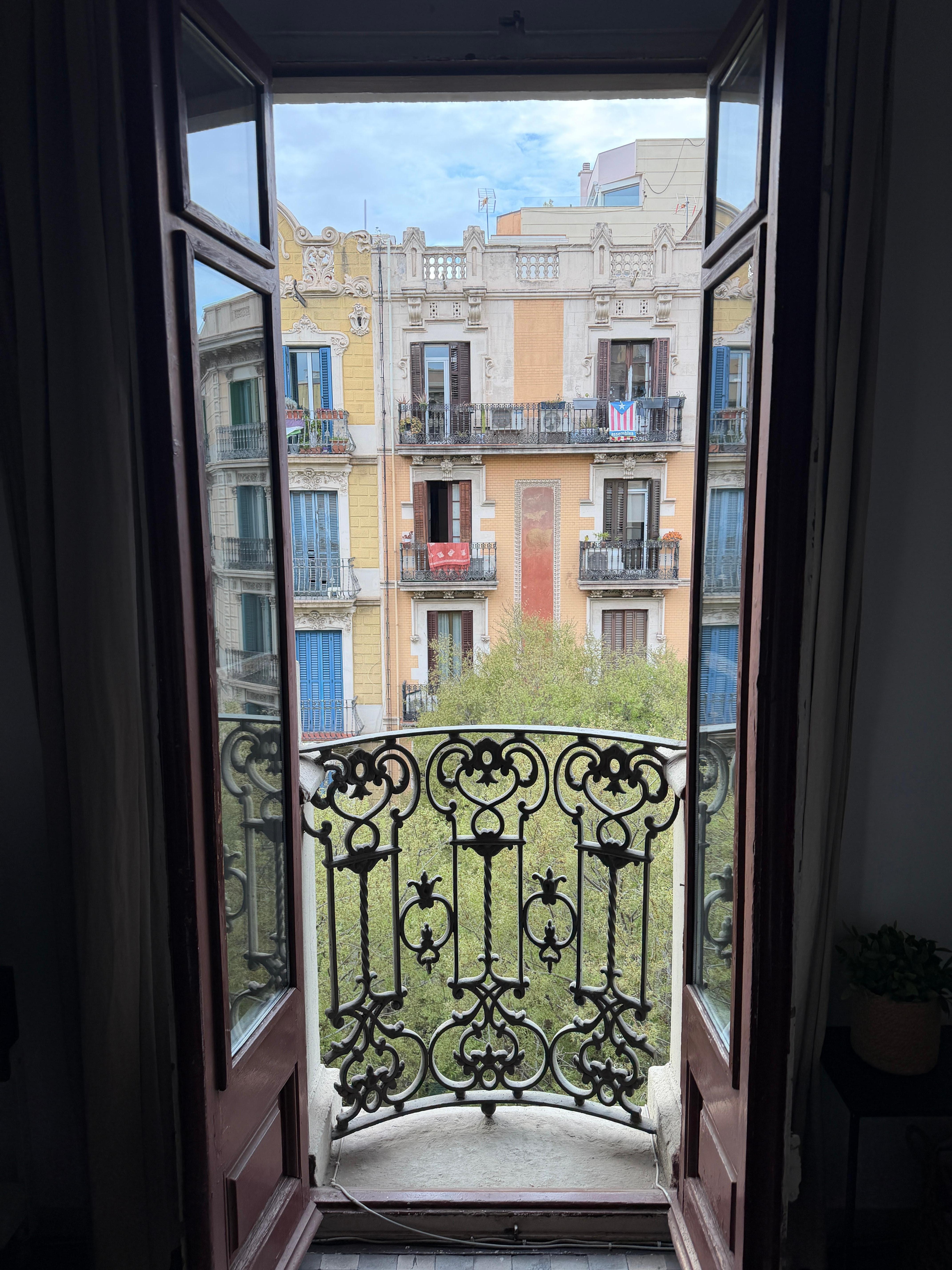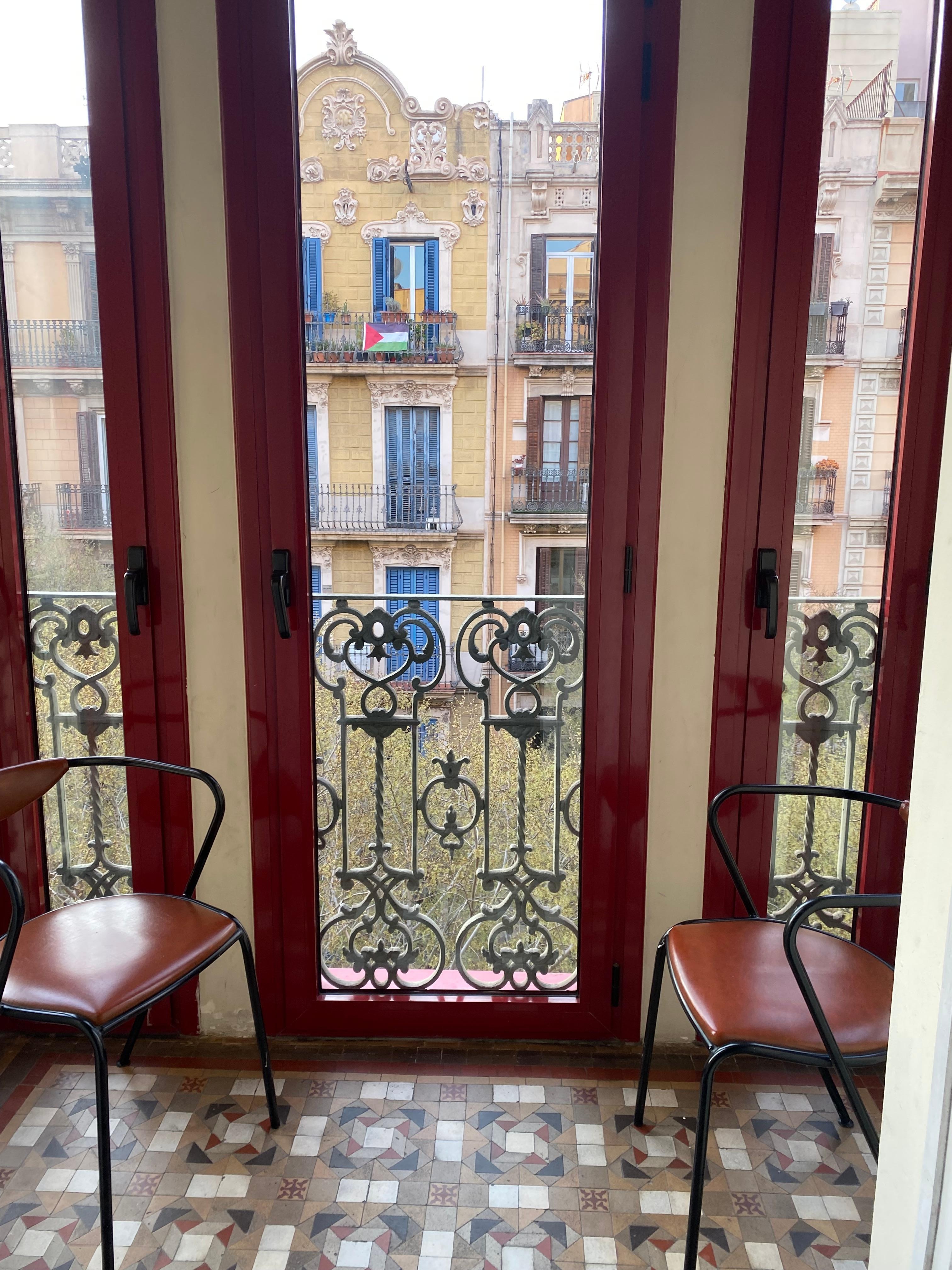 · Beautiful 2 bedroom apartment with a glass-enclosed balcony on the 5th floor of an 100-year-old Art Nouveau building, renovated outside and inside. The floors are still the original colorful mosaic, and the ceilings are 9 feet high. There is an elevator, air conditioning, central heating, and a full kitchen with granite countertop, pots & pans, dishes, etc. One full bathroom with toilet, sink, and half-tub with shower. The living room has a dining table and chairs, a sofa, a 21-inch TV, You can see the tips of La Sagrada Familia from the enclosed balcony.