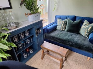 The garden room has patio doors that lead into a large enclosed garden (perfect for your dog) with patios and several seating and eating areas.