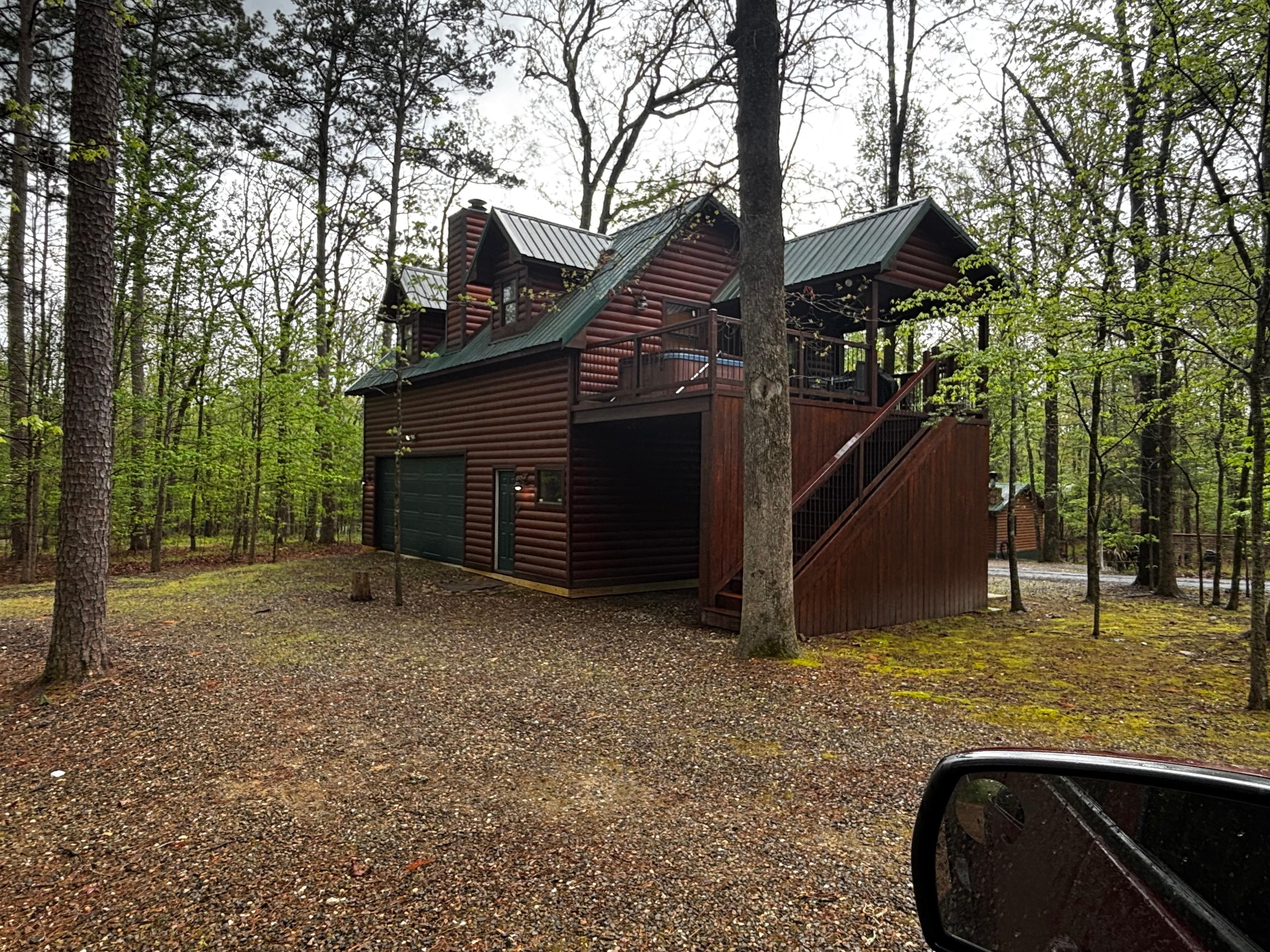 Squirrel's nest is a two story, two-bedroom cabin and is conveniently located in the heavily wooded area of the Northern Hills addition. It is truly a Nest to hide-a-way in whenever you need to but has all the comforts of home including a hot tub and covered parking! You'll enter the Squirrel's Nest through the downstairs garage staircase. Once you get upstairs, the nest is all on treetop level - one floor upstairs. To the right is a wall of windows that overlooks the covered deck and starlight view hot tub. To the left is the living room/kitchen, a precious little dining nook, and the hallway to two bedrooms. The kitchen is full of light with custom cabinetry and top of the line appliances while the living room offers a flat screen TV with DirectTV access, rock fireplace, and comfortable seating. Upstairs on the covered deck you'll find a gas grill and patio table and chairs for a perfect meal or morning coffee. The hot tub is located on the deck as well but is uncovered to offer you that perfect view of the nighttime sky. The stairs lead down to the covered parking area as well as the private fire ring. Squirrel's Nest is a perfect getaway for a couple, small family, or a few friends looking for a relaxing hideaway. Pets welcome, $25 per night, per pet.