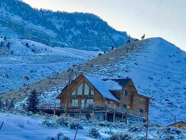 Wrap around porch to view the scenery and nature at its best....White-tailed deer, Mule deer, Pronghorn, elk, and Moose are family favorites to watch from the home.