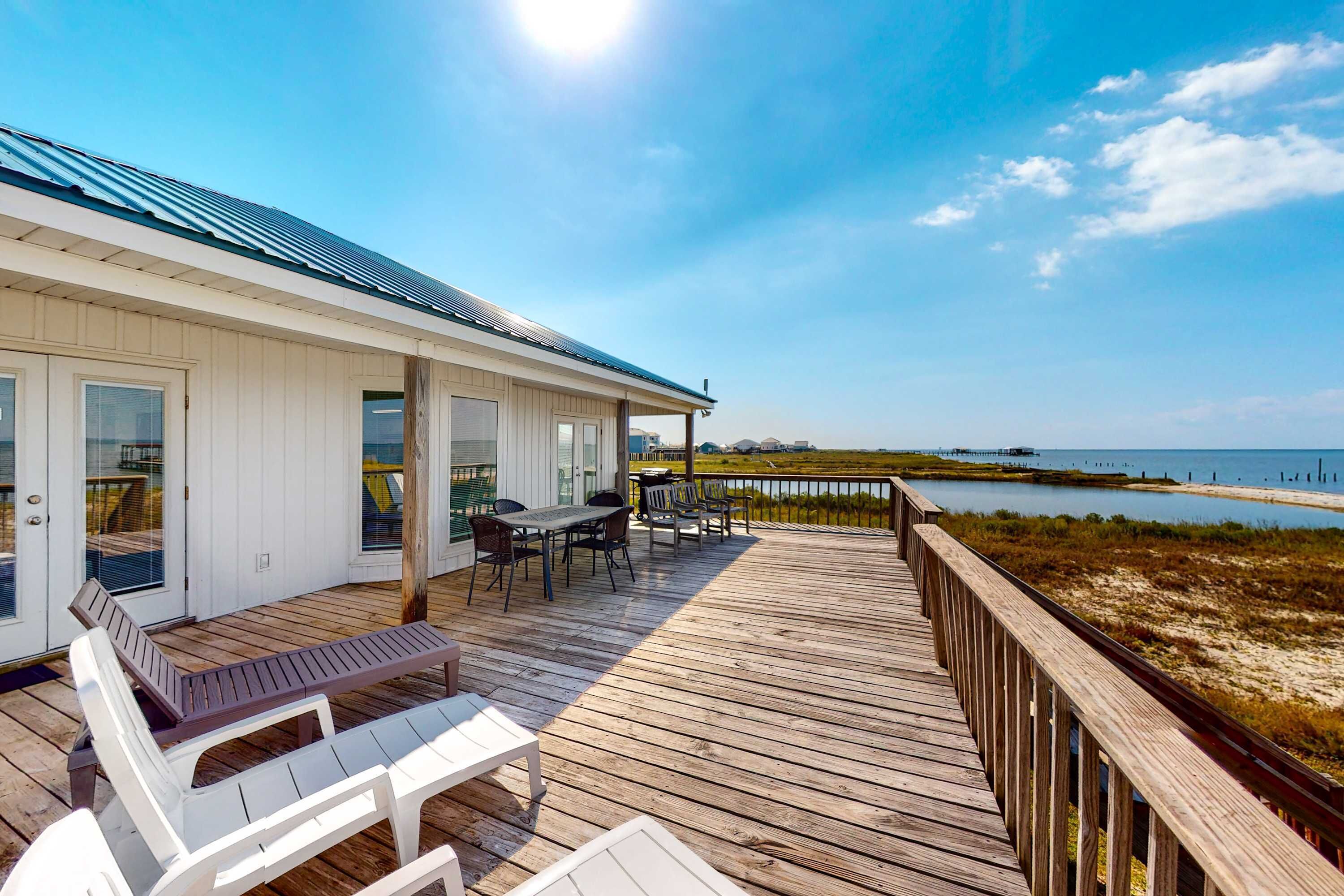 gulf-side of the home, with a center covered porch, two screened porches, and a private