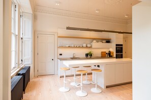 Windsor Townhouse is a striking three-storey Georgian home that blends grand period character with modern comfort, right in the heart of Edinburgh. Step through the front door and into an elegant entrance hall, where soaring ceilings and ornate detailing set the tone. The first floor is a true social hub, with two welcoming reception rooms, a stylish toilet, and a sleek, fully equipped open-plan kitchen and dining area. These generous spaces are flooded with natural light, perfect for gathering with family or friends.