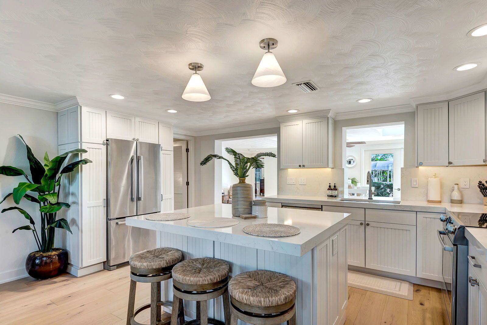 When you enter you will be greeted by a beautiful open floor plan showcasing the living room, dining room, office and kitchen. The living room is equipped with a 75" 4k TV with Dolby Atmos surround sound. Beautiful tropical decor and fully opening zero corner slider glass doors transform the living room space into an open-air indoor/outdoor oasis. The kitchen comes fully stocked with dishware, cookware, and some stock supplies, and features an reverse osmosis drinking water. system. Should you have a particular question about an item, feel free to ask if we have it.