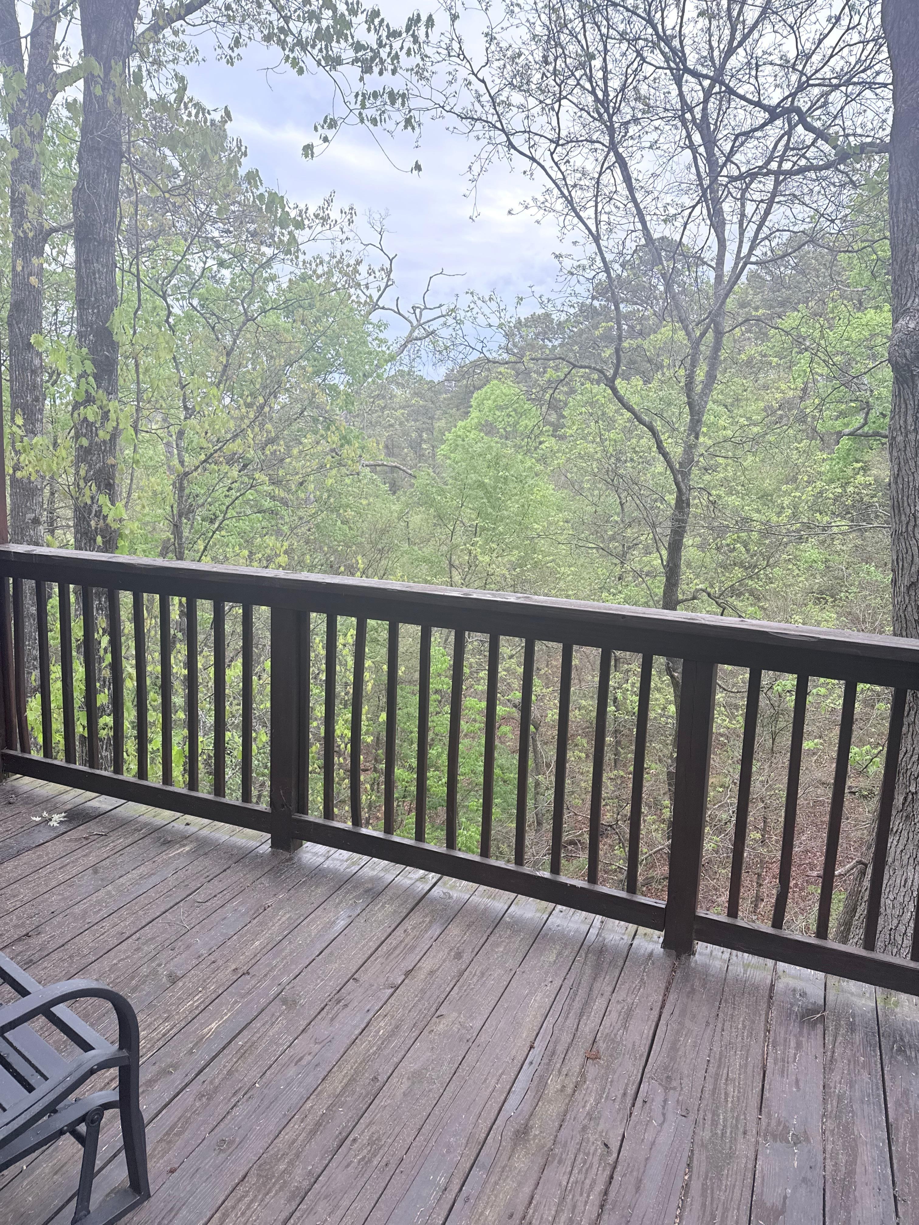 “The Chateau Treehouse” #11 located at Oak Crest inside Eureka Springs, AR on highway 62, features a jetted tub for two, private deck, and fireplace. The layout includes: living room with 40″ flat panel TV and DVD player; kitchenette with refrigerator, microwave and coffeemaker with coffee; bedroom with king bed and cable TV/DVD; bathroom with stall shower; and private deck with glider, bistro table and chairs.