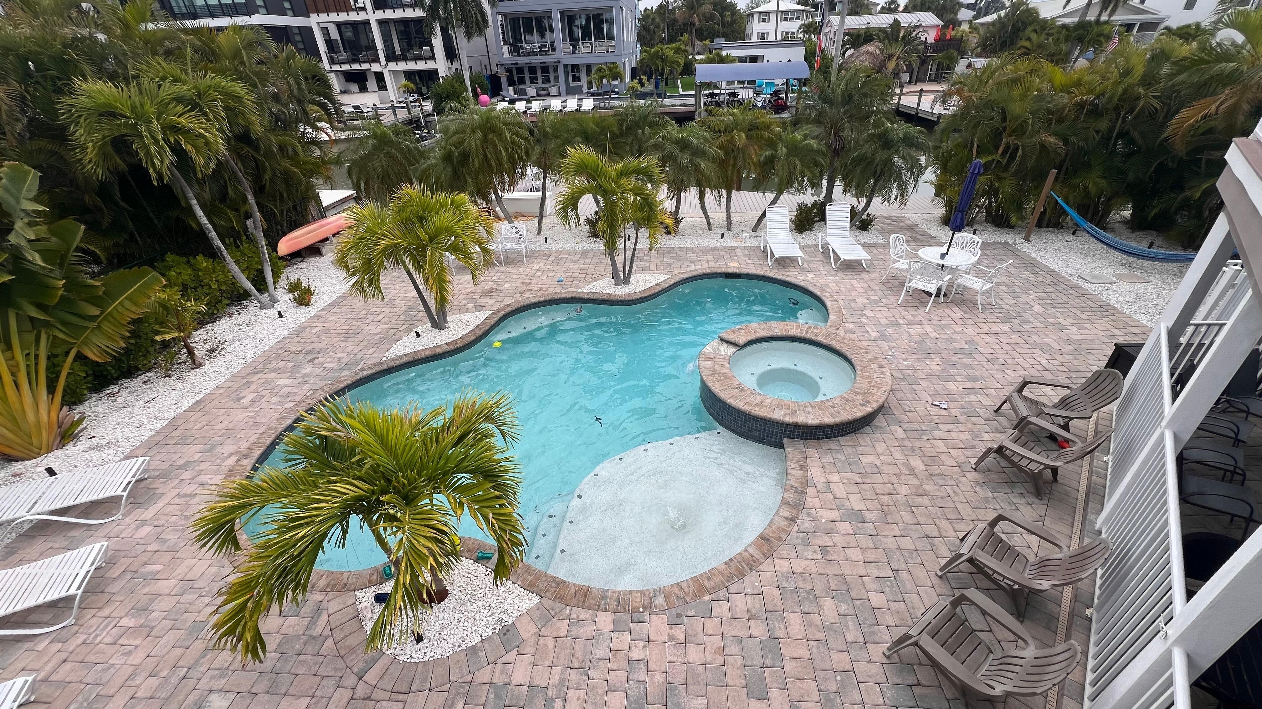Primo Pool and Palms is walkable to the Beach, Times Square and Old San Carlos Blvd where you will find water sport rentals, beach shops and plenty of bar/restaurants. A beach cart and beach chairs are included that you can take down to the beach. Or you can just stay put and relax in the free form pool with tanning platform and attached spa surrounded by the tropically landscaped yard. You can also sit on the large dock and look for the manatees and dolphins that occasionally visit the canals. Maybe a kayak cruise for two into the intercoastal to look for Dolphin, Manatee or bird watching. Relax in the hammock and listen to the sway of the palms. And If you're a boater, bring/rent a boat and tie up to the dock and be just minutes from the Gulf! You will feel that you have found a hidden Oasis at Primo Pool and Palms!