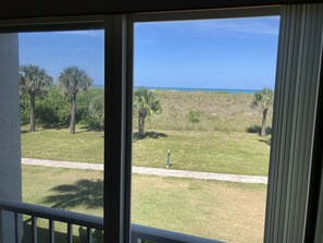 Let the ocean waves mesmerize you from the comfort of this condo. Located steps from the beach! Top floor, split plan, fully furnished corner unit condo with an ocean view. This condo has volume ceilings, ocean views from the living areas and all bedrooms. The master suite features a queen sized bed, plenty of storage, with a walk in shower and a walk in closet. The guest bedroom features a queen bed. The third bedroom is set up as a sitting room. Grab a book, a cool drink, and snuggle up as you listen to the rhythm of the ocean. The guest bathroom features a tub/shower combo. There is also a half bath off the hallway. All available amenities are at Ocean Village are at your disposal. The community has a 24 hr. manned security gate. Come enjoy a slice of Florida Paradise!