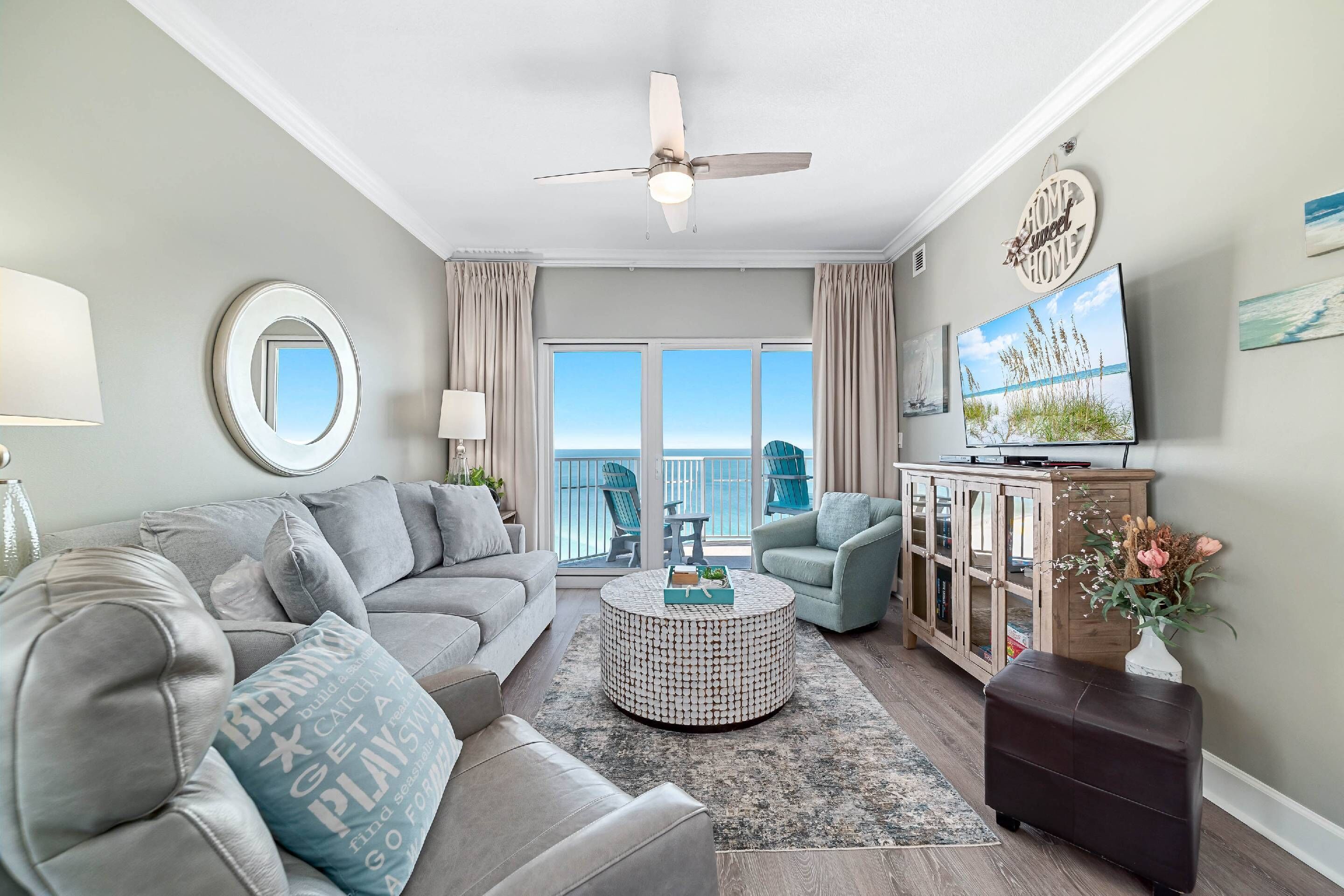 The living room is the heart of the condo, featuring a Smart TV, ideal for movie nights or catching up on your favorite shows. With balcony access from the living area, you can step outside and enjoy breathtaking views of the Gulf any time of day.