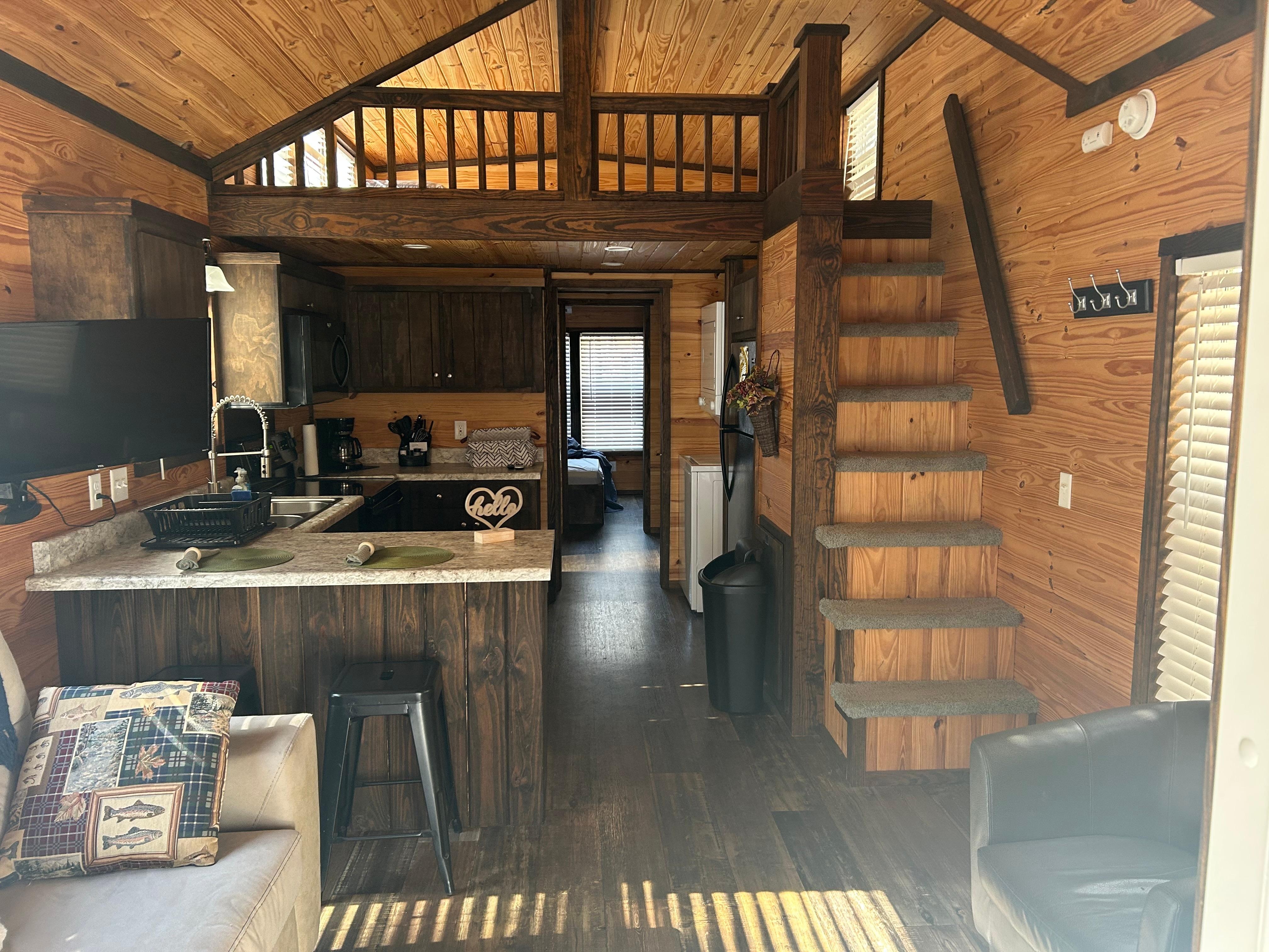 The Gray Loft vacation rental is an OFFICIAL TINY HOUSE located at the Byron Herbert Reece Farm Village on Hwy 19 south of Blairsville, GA. The unit has a small living area, a kitchen with full-size appliances, a stacked washer/dryer, a bathroom with shower, a queen bedroom, bunkbeds, and a loft with twin mattresses. The unit has a covered front porch overlooking the Wolf Creek (perfect for trout fishing) and a park-style outdoor grill. Community fire pits are available on the property. Just 9 miles south of the Blairsville town square, the Gray Loft is convenient to Brasstown Bald, several local waterfalls, and hiking trails including a 3-mile trail directly from the Farm Village to Vogel State Park!