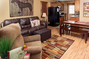 Prancing Doe is 1 of 4 cabins (Friendly Fawn, Button Buck, Trophy Buck) that are perfect for small groups or romantic getaways, when booked alone! Or... If you are looking for the perfect alternative for family and friends that enjoy each other's company by day but the privacy of their own space at night, then booking all 4 cabins at Whitetail Ridge will give you just that! The entire property can accommodate up to 20 guests. This is the perfect spot for family fun or romantic evenings, stargazing in the private hot tubs, snuggling in front of the fireplace, or a place where your mind, body, and soul will relax and become one with nature. This spacious property is an ideal place for a relaxing couple’s getaway, or an adventure filled family vacation. We offer one and two bedroom cabins in a wooded setting surrounded by the natural beauty of Hocking Hills. Friendly Fawn and Button Buck each have one bedroom with queen bed and a sleeper sofa accommodating up to 4 guests. Prancing Doe and Trophy Buck each have 2 bedrooms with queen beds and a sleeper sofa accommodating up to 6 guests. Trophy Buck has a finished basement/party room that can be accessed via a spiral staircase from the 1st floor or from the outdoor patio. The party room has a foosball table, bar, electronic dart board, and an excellent sound system. Each cabin has a private hot tub, satellite TV, free WIFI, fire ring and a charcoal grill. Whitetail Ridge Cabins may be reserved individually or combined to accommodate up to 20 guests. Old Mans's Cave and Hocking Hills State Park are a short 8-mile drive through the rolling hills. Hocking Hills Canopy Tours is easily reached 13 miles away. For those who don't want to leave the property, there is a catch and release fishing pond on the property and The Blue Moon Acres Horseback Riding Center is located just across the road.