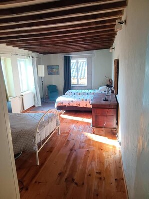 In the countryside west of Lyon (Coteaux du Lyonnais region), this character gîte is located in the upper part of the village of Thurins. On ground floor of stone-built house also including owner's second home upstairs (separate access). The gîte is accessed via a little staircase (made of stone) leading to terrace. Character interior : stone walls, tiled or parquet floors, exposed beams, wooden furniture (wardrobe, clock, piano...). Raised ground floor : living room (dining area, kitchen area), hall (desk, wall cupboard including washing machine), lounge (double sofa bed) leading to large bedroom with 3 single beds (2 beds 80 cm large that can be joined to form queen-size bed on request + 1 bed 120 cm large). Small shower room. Separate Wc. Bed linen and household linen (dish towels) supplied free. On request : towels for hire, travel cot. Outdoors : small private terrace (adjoining, facing South) with garden furniture, sunshade, small garden with trees (unclosed), deck chairs. Stone barbecue (shared), parking opposite the gîte. Plateau d'Yzeron (leisure activities) 6.5 km, Zoo of Courzieu (raptors and wolves) 16.5 km.