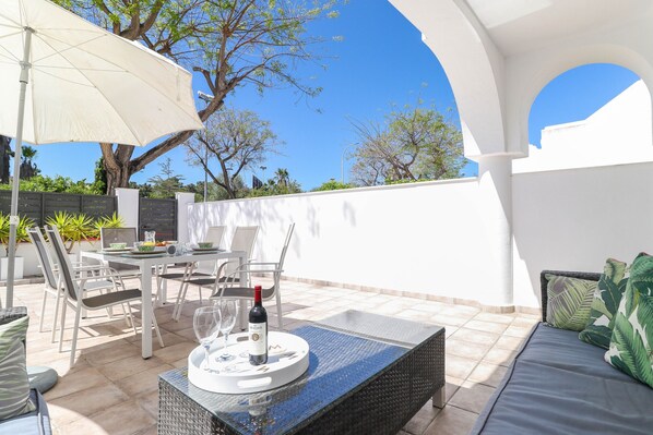 A superb townhouse with large sunny terrace located in quiet residential area only 10 minutes drive from Marbella town. Greatly appointed holiday home offers plenty of outdoor space to enjoy spanish sunshine at its best! On the main floor you have: bright living room, smart TV with streaming device to watch all your favourite movies and channels, AC unit and fully equipped open-plan kitchen with access to the back patio. There is also a small bedroom with ceiling fan (no AC unit), double bed (1.35x1.80cm) and a shower room. Upstairs you have spacious master bedroom with high ceilings, king size bed (1.50x1.90cm), AC unit, mirrored wardrobes with safe, adjacent shower room and access to another sunny terrace with sun loungers and chairs to sunbathe all day long. This holiday home located in the 4 star VIME Reserva de Marbella aparthotel and you have free access to all hotel’s facilities onsite, such as 2 wonderful outdoor pools surrounded by gardens with sun beds and Balinese beds (at extra fee), as well as a heated indoor pool with Jacuzzi, sauna and fitness room. Bar/restaurant on site offers delicious meals and great friendly service. There is also outdoor playground for the little ones. Free parking on the street just outside of the house. Large supermarket that opens 7 days a week located just 2 minutes walk from the house. Within walking distance couple of restaurants, sports bar and a bus stop to take the bus to Marbella. Nearest beach and Cabopino port is 20 minutes walk or 5 minutes drive. Lively town Elviria with plenty of restaurants and bars only 3 minutes drive. Marbella town centre - 10 minutes drive. PLEASE NOTE: The house situated at the bottom part of the complex close to the highway and you can hear the road noise. It takes few minutes walk to the main swimming pool area with all amenities.AC units ( cold/heat) in the living room and master bedroom upstairs. In the 2nd small bedroom only ceiling fan.