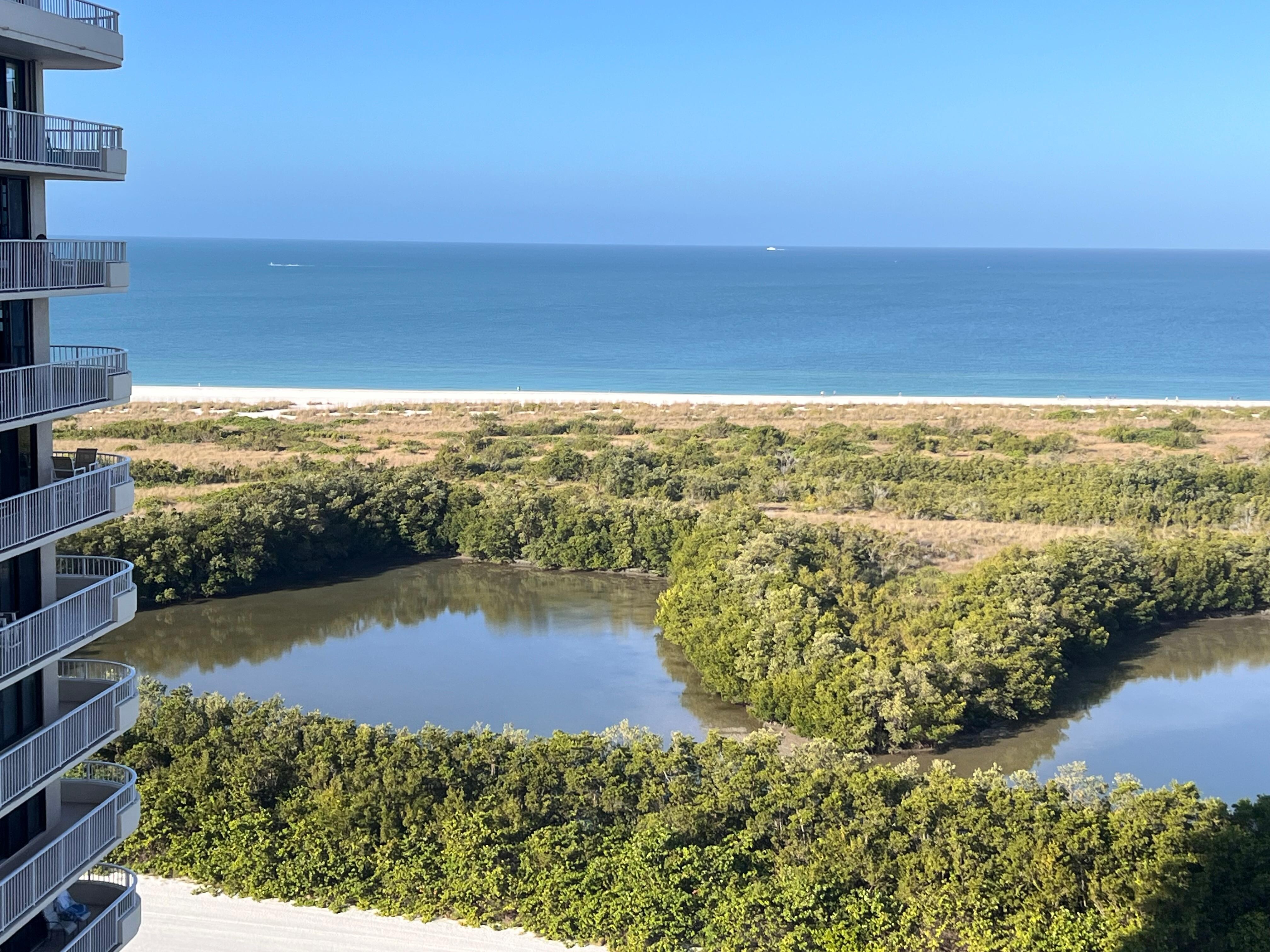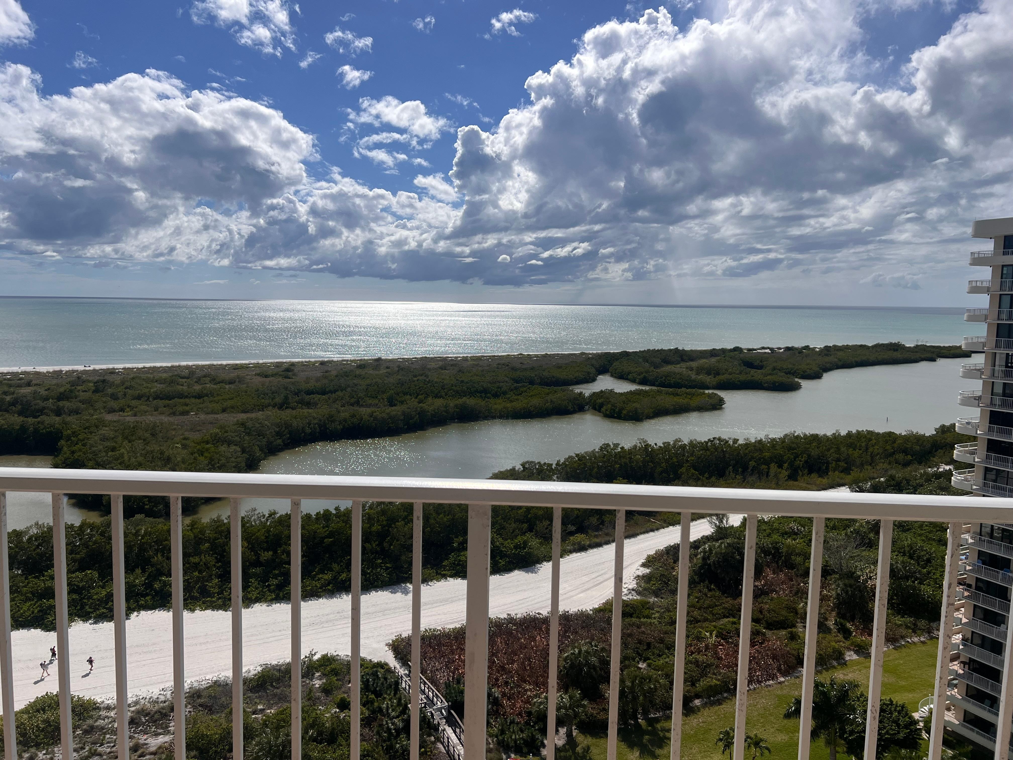 Nice 2-bedroom apt, very clean, modern kitchen, closet full of beach chairs, umbrellas, beach toys. Huge balcony with beautiful beach/marsh/sunset view. Large pool. It's 1 of 4 large towers, easy parking and can walk to few restaurants (italian, thai/sushi and breakfast/lunch cafe), drive to markets. It's about half hour from Naples for higher end shops and dining. The only drawback is that it's a VERY wide beach and while beautiful, it's a haul to walk with chairs and stuff out to water. Yet, great for walking so we mostly hung by the pool and did our walking along the beach. The balcony is very sunny in the afternoons with table/chairs. The owner Ken is very accessible.