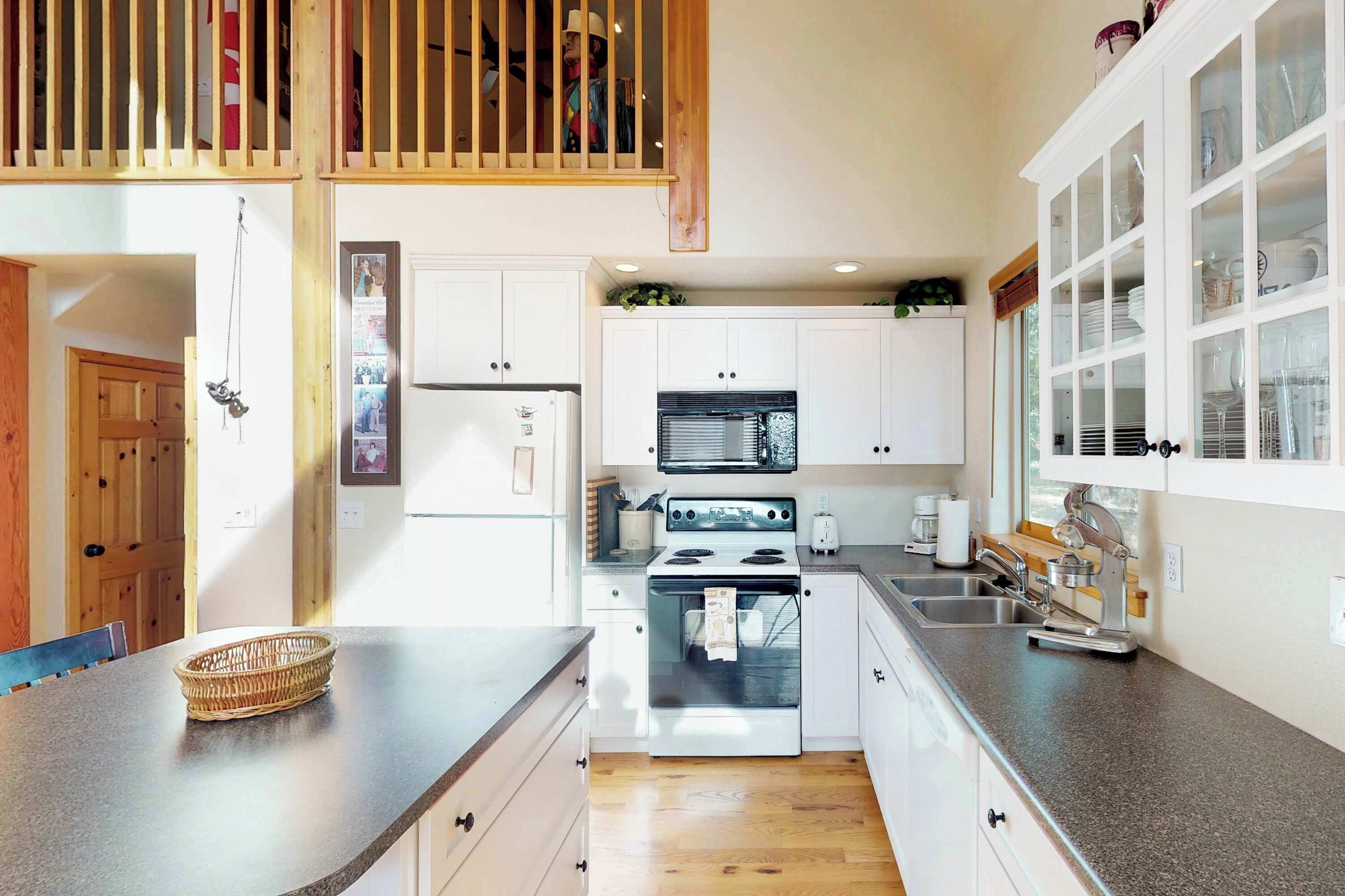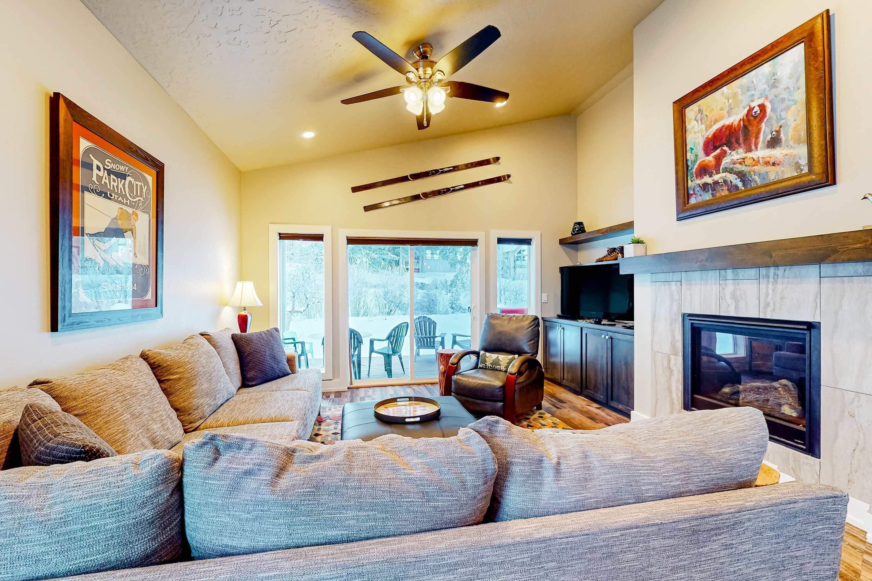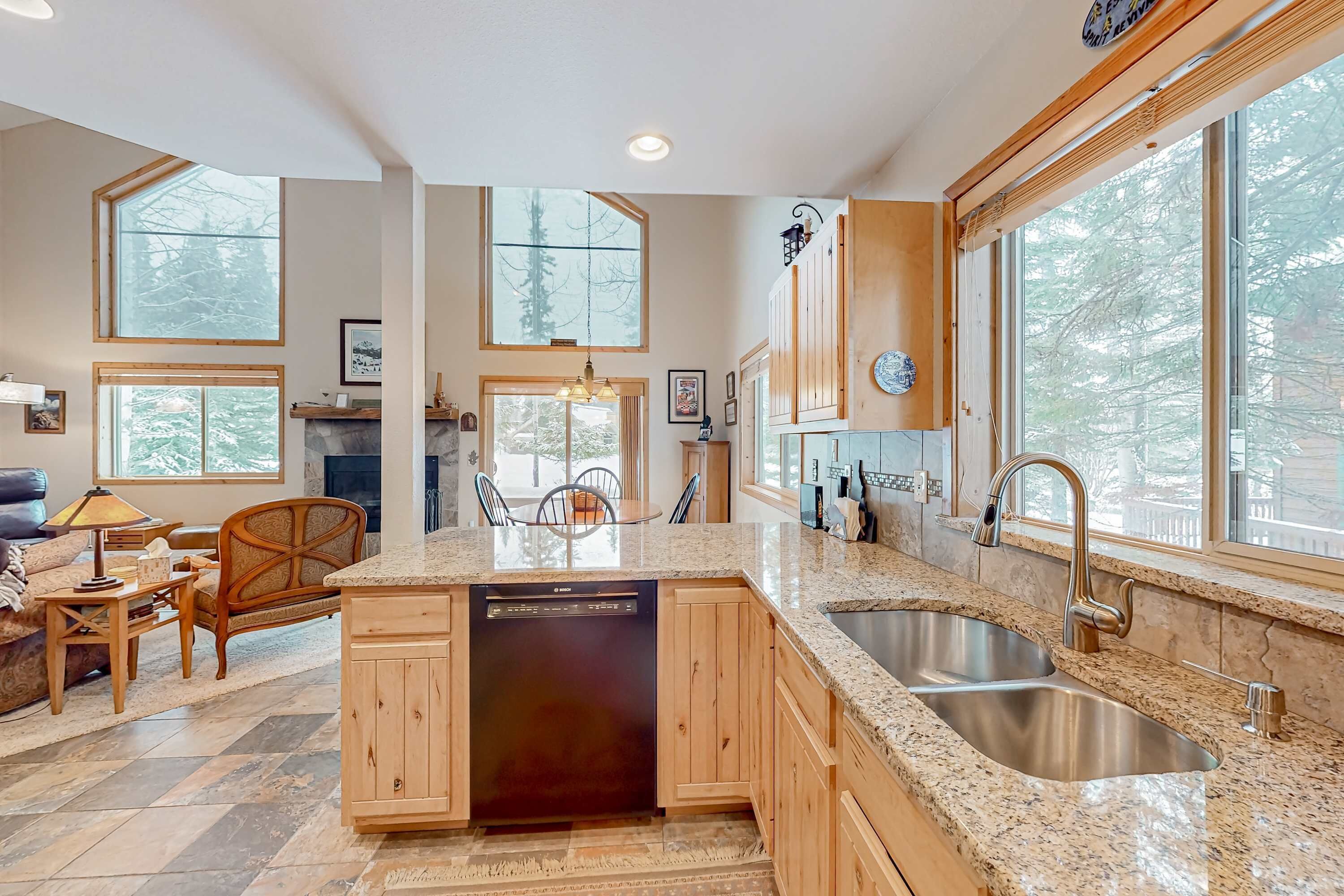 This lovely townhome has an inviting, open floor plan, hardwood floors, stone hearth with propane fireplace, and vaulted beam ceilings and can accommodate up to 6 guests comfortably in three bedrooms and 2.5 bathrooms. The property features an intimate balcony located off of the master suite, and a larger, west-facing balcony with living room access and gas grill for cooking. The modern kitchen with stainless steel appliances and elegant granite counter tops make for plenty of work surface for your inner chef to prepare a memorable meal, which can be enjoyed from either the formal dining table or from counter seating.