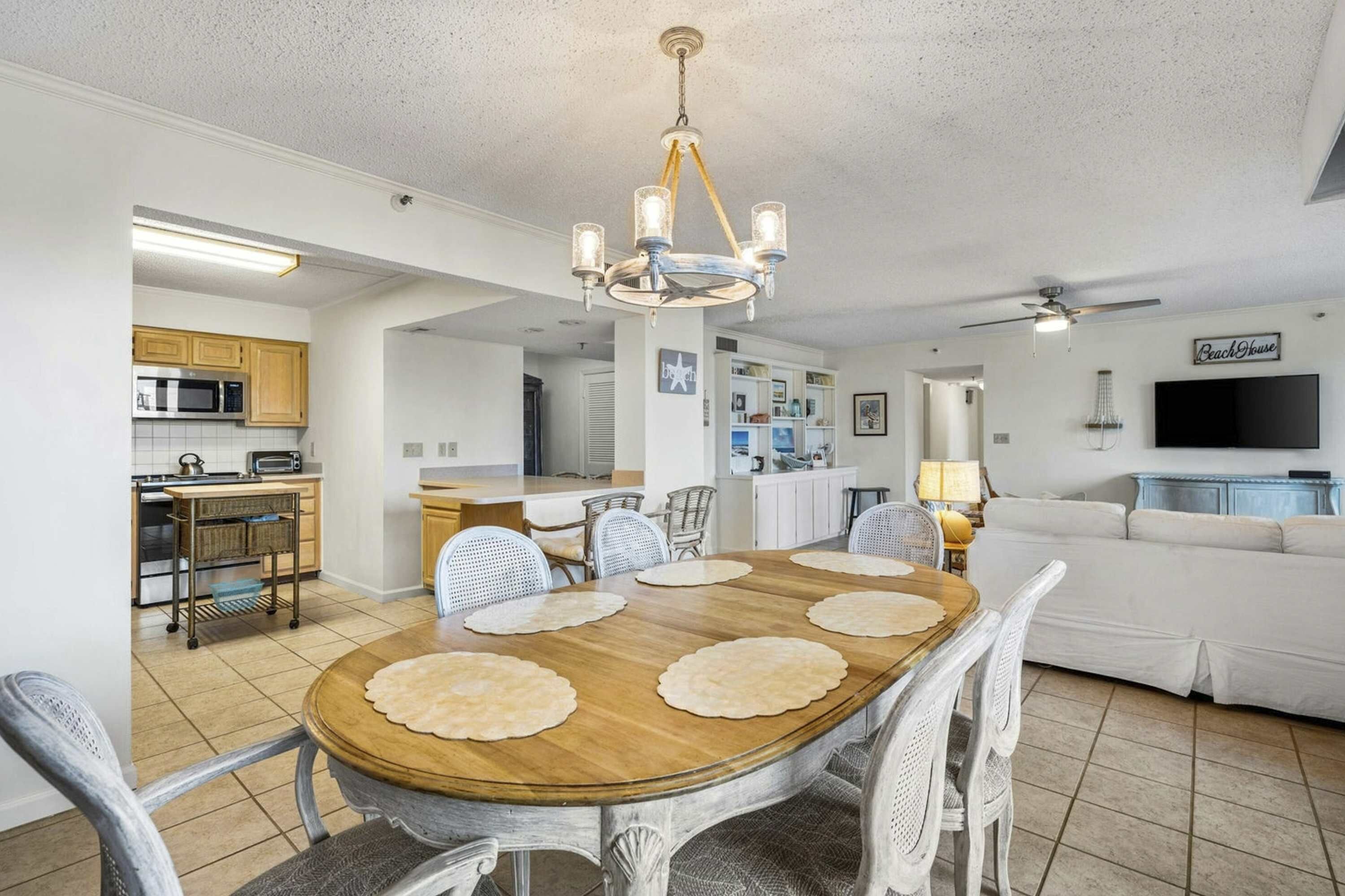 In the living room, you will find a TV with an HD converter, iPod docking cables, movies, and board games. This condo is perfect for a family vacation and provides all the comforts of home right on the Gulf of Mexico.