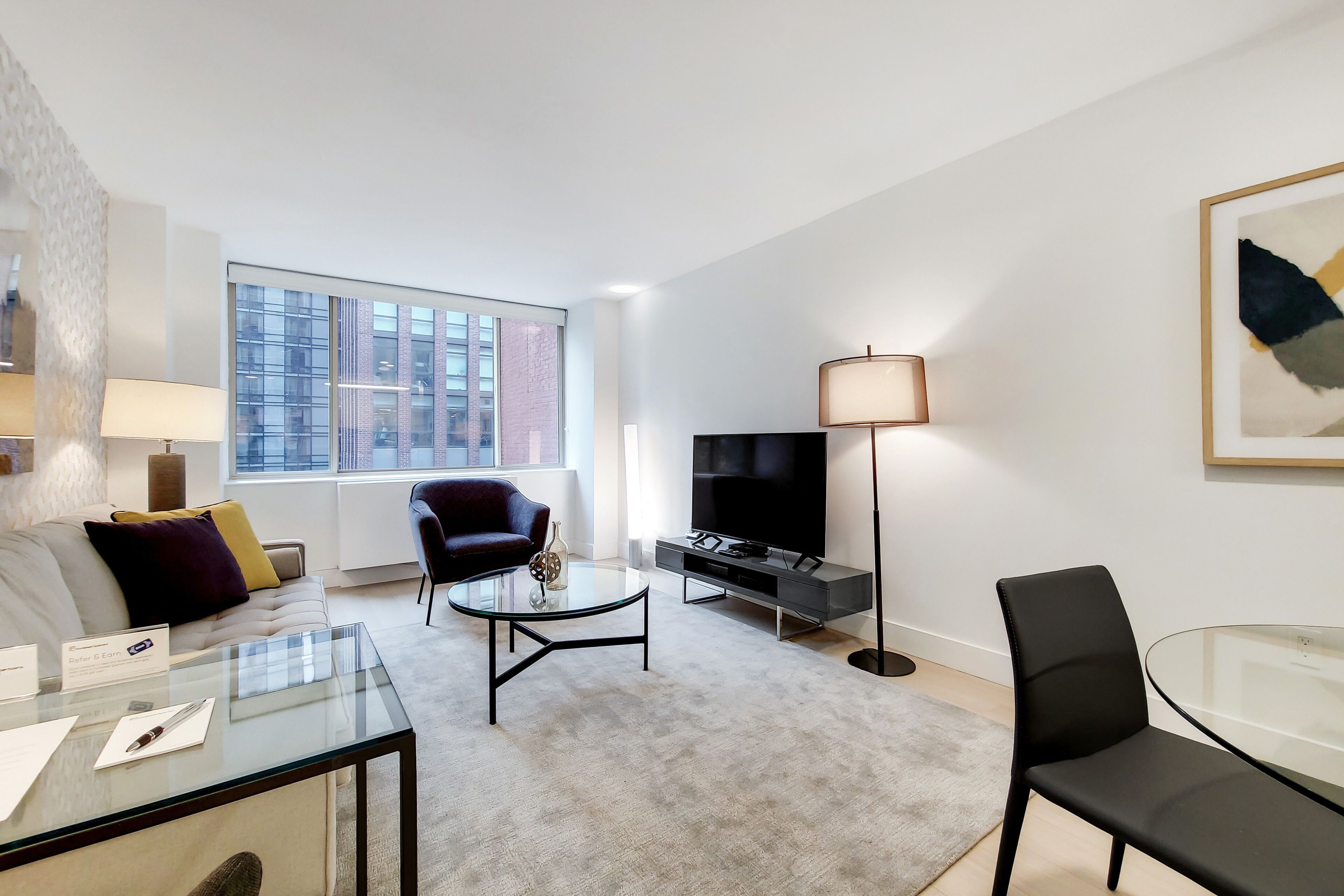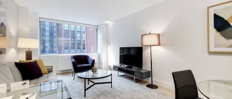 Stay downtown in casual-cool yet sophisticated style in this one-bedroom apartment, featuring gorgeous finishes like engineered wood-plank flooring, large-scale precision windows, top-of-the-line appliances, copious closet space, and a modern bathroom. The beds provided are fitted with plush linens and pillows. All Furnished Quarters apartments include 24/7 guest service.