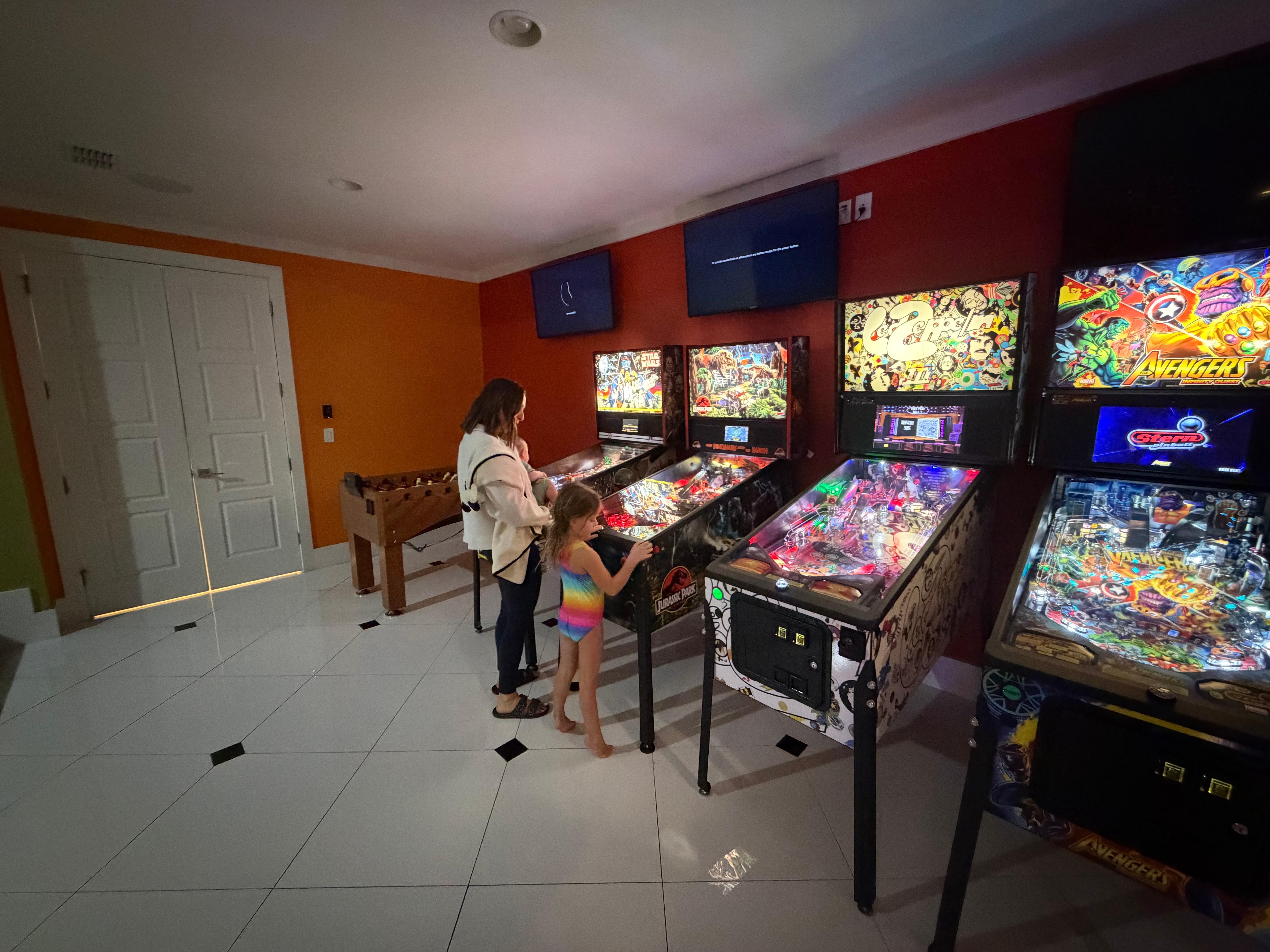 Arcade with HDTVs, pinball machine, car and motorbike racing arcade machines